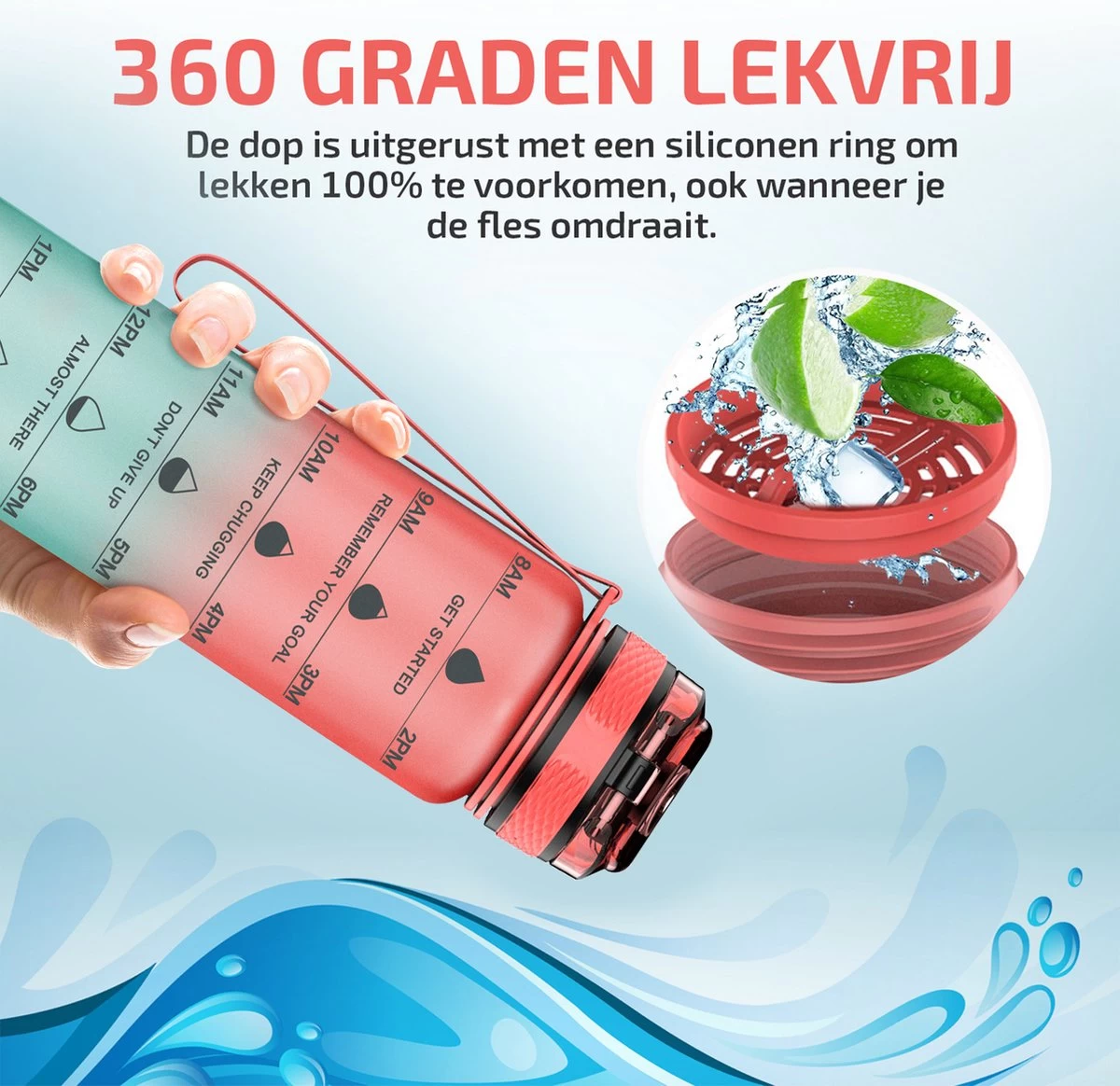 Sur cette bouteille, nous avons combiné des indications de temps avec des citations de motivation amusantes. Cela facilite le suivi de votre consommation quotidienne d’eau et vous motive à boire suffisamment d’eau chaque jour! Il vous suffit de remplir le flacon deux fois par jour pour atteindre la quantité quotidienne recommandée d’eau. Il a été prouvé que cela augmentait votre niveau d’énergie tout en favorisant la perte de poids et le rajeunissement!