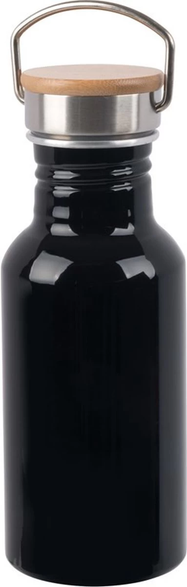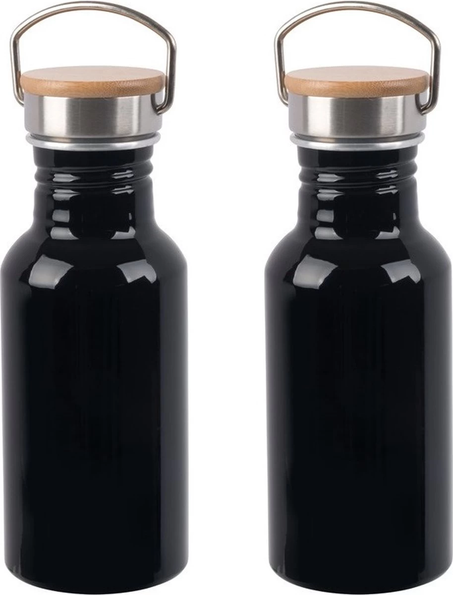 Bouteille d’eau / gourde en aluminium 2x pièces noir avec bouchon à vis en bambou 550 ml et poignée en métal. Dimensions : environ D7,5 x H19 cm. Contenu : environ 550 ml, 55 cl. Poids: 125 grammes. Matériel : aluminium. Sans Bpa : oui. Convient au micro-ondes : nee. Passe au lave-vaisselle : nee. Convient au congélateur : oui.