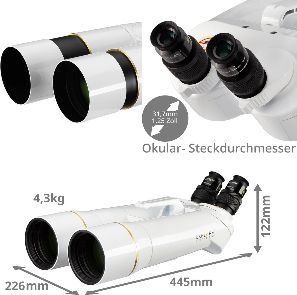 - Recommandation de trépied en option : EXPLORE SCIENTIFIC U-mount avec trépied de terrain (Art. No. 0114300)