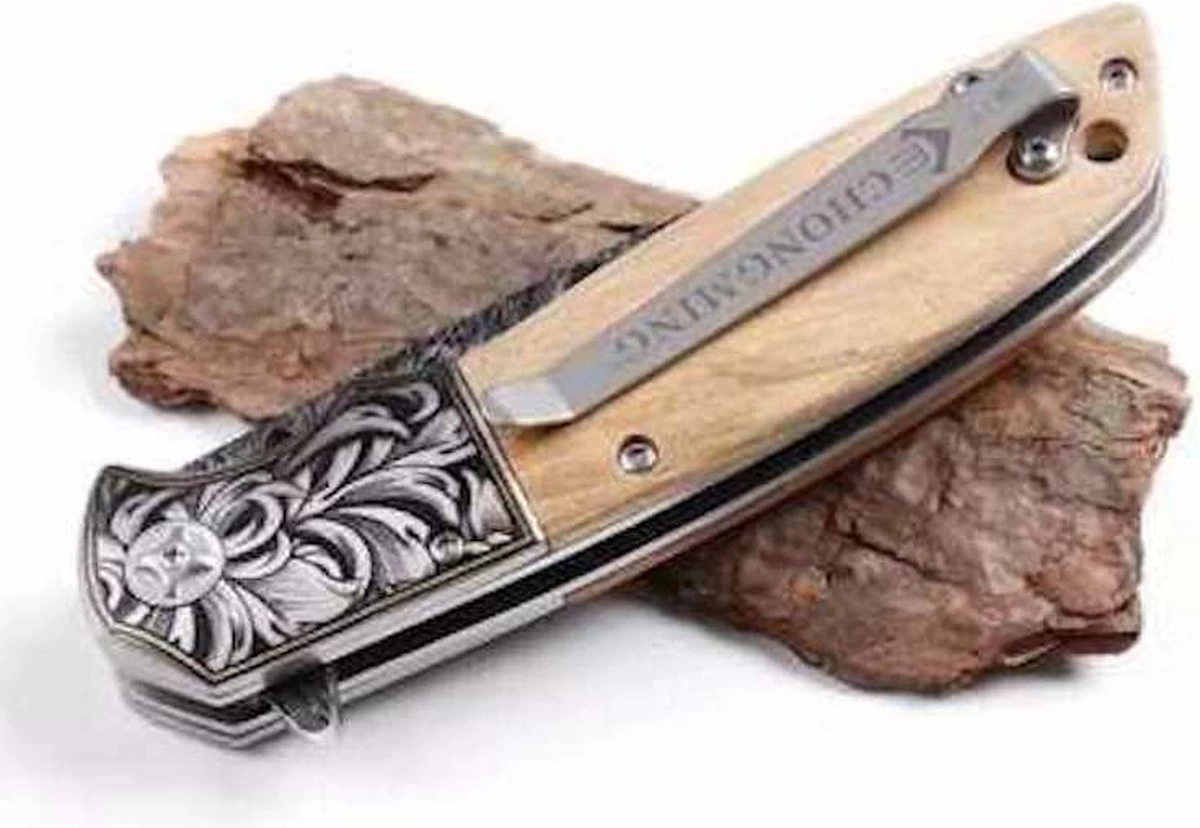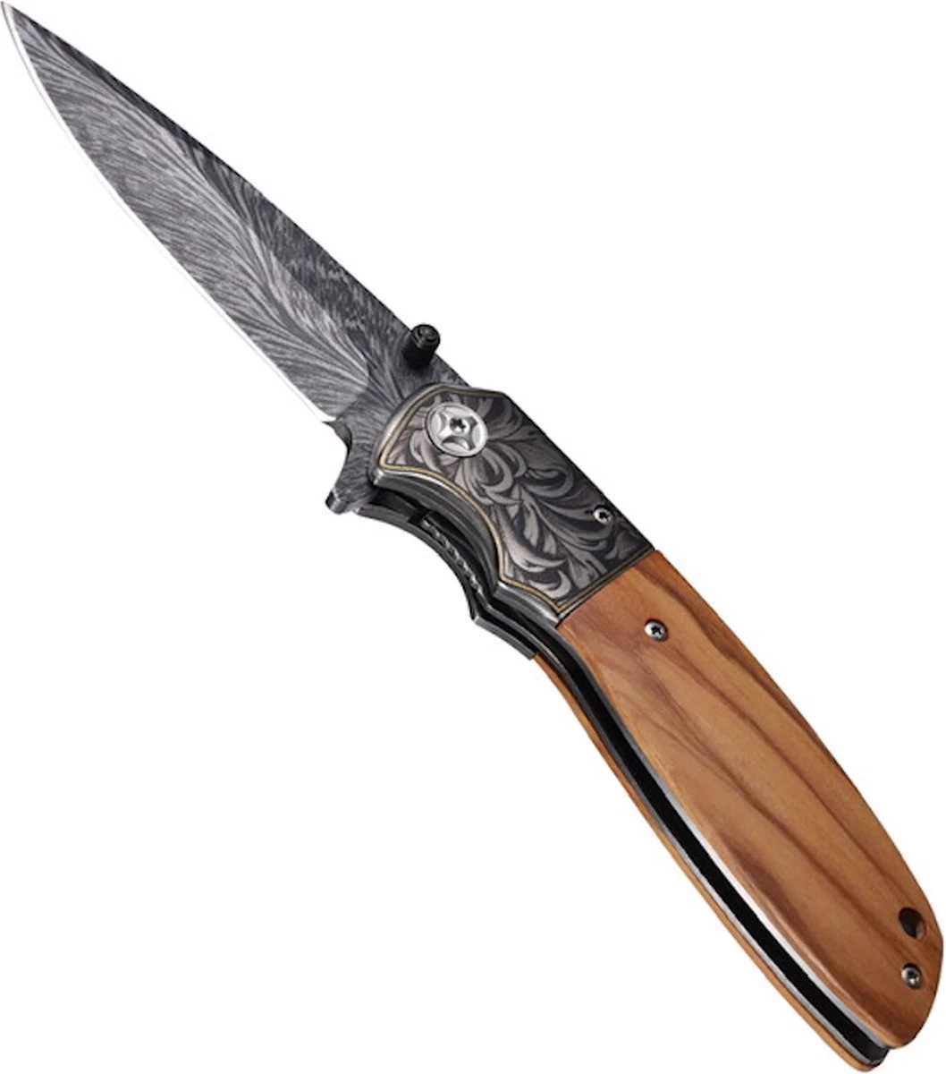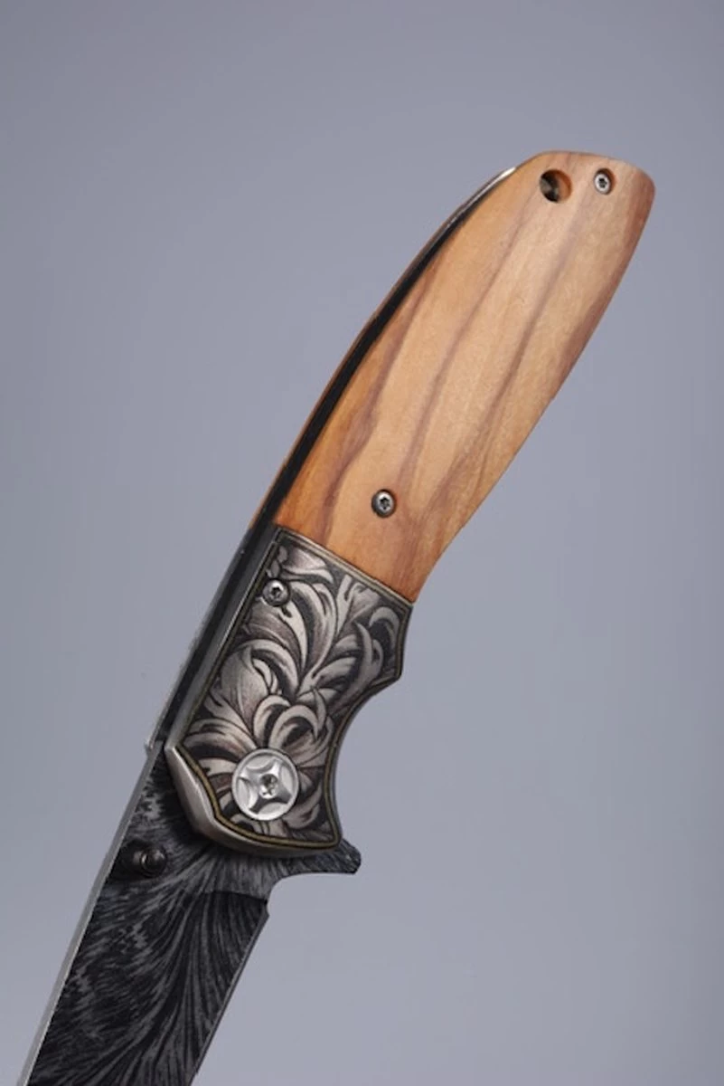 Le couteau de poche est imprimé de beaux motifs, à la fois sur la lame et sur une partie du manche. Le reste du manche est fait de la belle essence de bois authentique, le bois d’olivier.