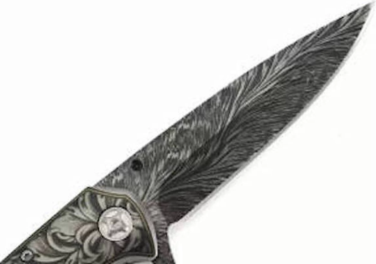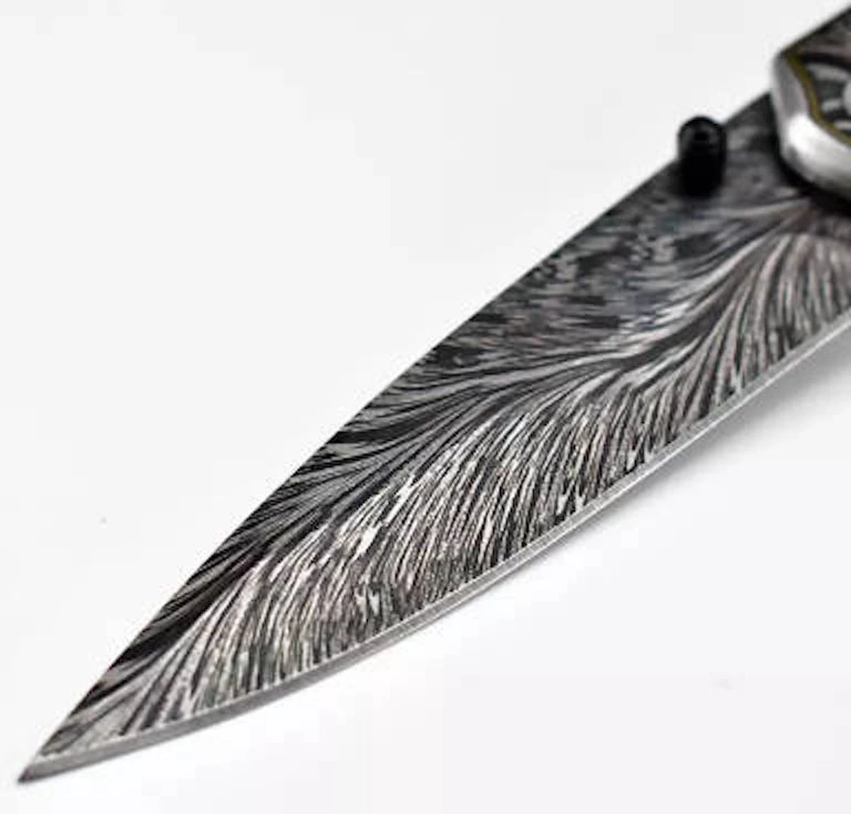 Ce couteau de poche est composé d’acier 440C et d’acier Damas, qui est la combinaison parfaite d’acier pour un couteau de poche ! C’est parce qu’il conserve bien sa netteté, conserve sa belle couleur et est facile à affûter.