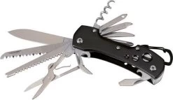 Couteau de poche en acier inoxydable noir 12 fonctions 9,5 cm. Couteau de poche bon marché avec 12 fonctions: ciseaux, couteau, scie, 2 tournevis, poinçon, lime, lime à ongles, mousqueton, ouvre-bouteille, ouvre-boîte et tire-bouchon. Idéal pour le camping ou la pêche. Taille: 9,5 x 3,5 x 1,5 cm. Matériel: aluminium / acier inoxydable. Couteaux de poche multifonctionnels d’extérieur en noir.