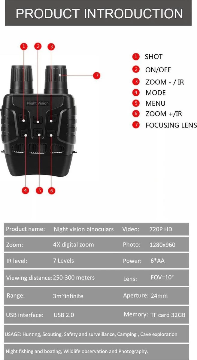 Le DrPhone Night vision, est une paire de jumelles utilisables de jour comme de DrPhone la fonction Night Vision , vous pouvez voir jusqu’à 300 M la nuit avec une image nette. Il y a une fonction photo et vidéo sur ce produit afin que vous puissiez enregistrer tout ce que vous voyez et le montrer aux gens autour de vous. Le produit peut être bien utilisé pendant la Chasse, l’exploration, la Sécurité et la surveillance, le camping, la pêche de nuit ou la navigation de plaisance, l’observation de la Life sauvage et la photographie.
