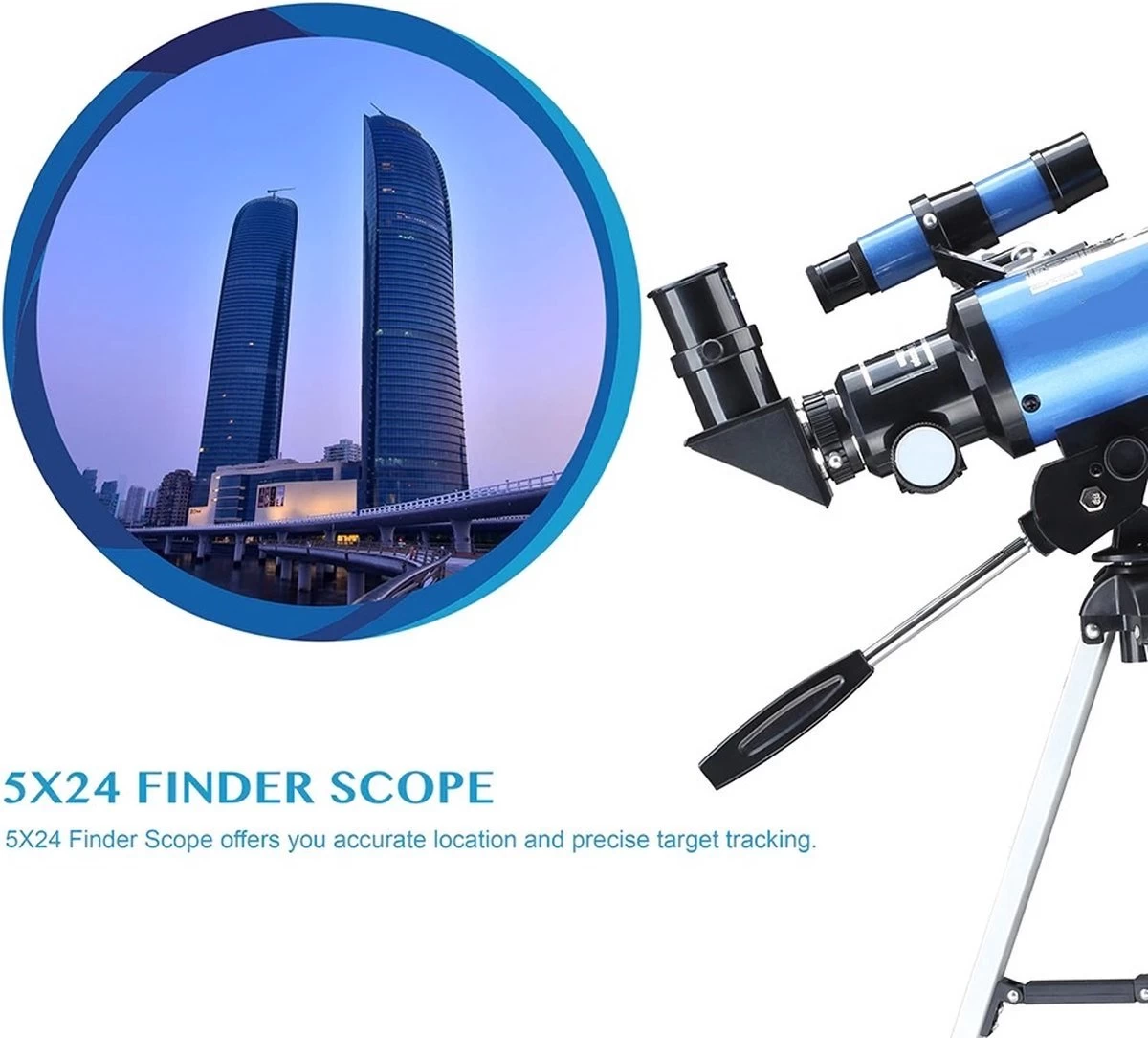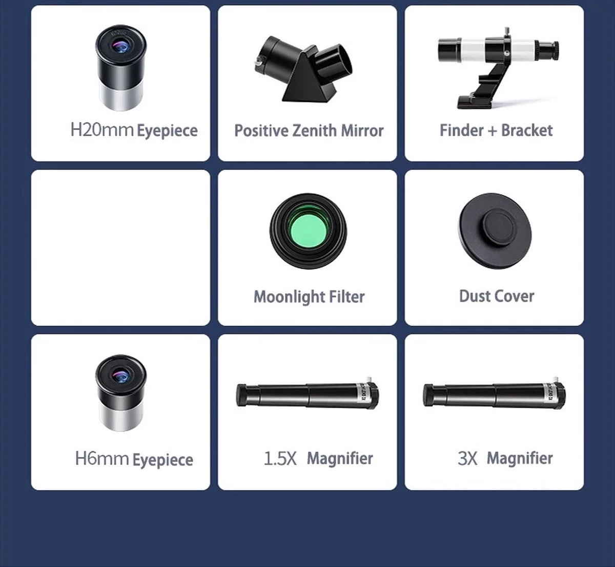 Multi-grossissement : grossissement 5-150X avec deux oculaires remplaçables (6 mm, 20 mm). Le grossissement de l’oculaire de 6 mm est de 50X, l’oculaire de 20 mm est de 15X. Avec un oculaire de recul 1,5X et une lens barlow 3X, le grossissement peut être augmenté de 15X à 150X. De plus, il y a un chercheur 5X24 avec support de montage, où vous pouvez facilement trouver la cible d’observation.