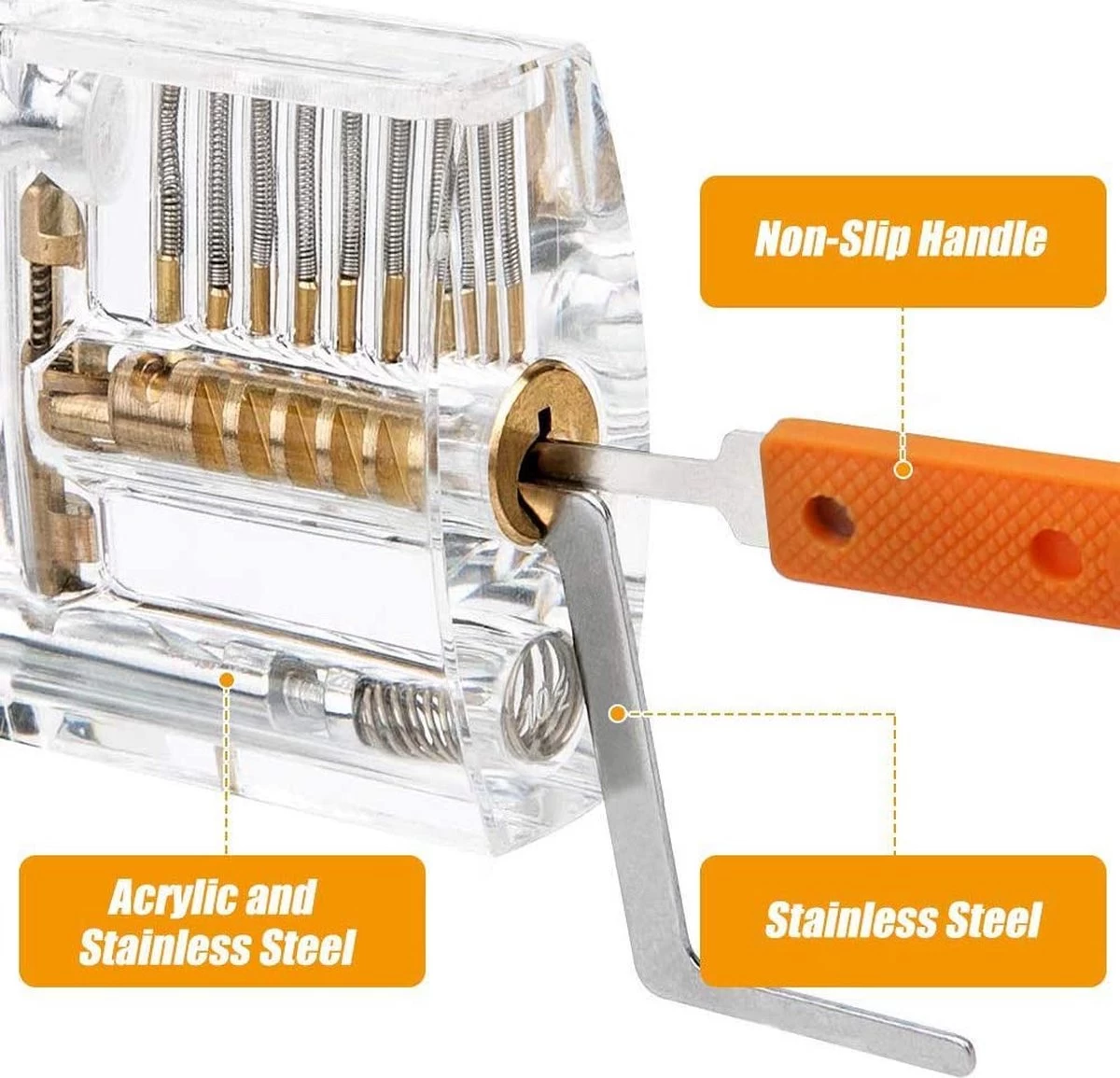| Contenu de l'emballage | 12 pics assortis, 5 tendeurs, 1 serrure à cylindre, 1 cadenas, 1 serrure à double cylindre et 1 pochette de rangement |