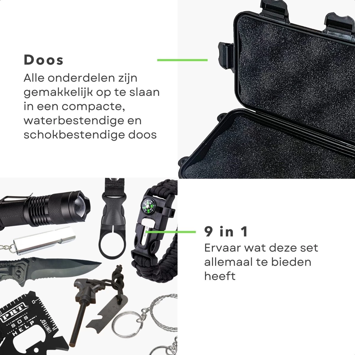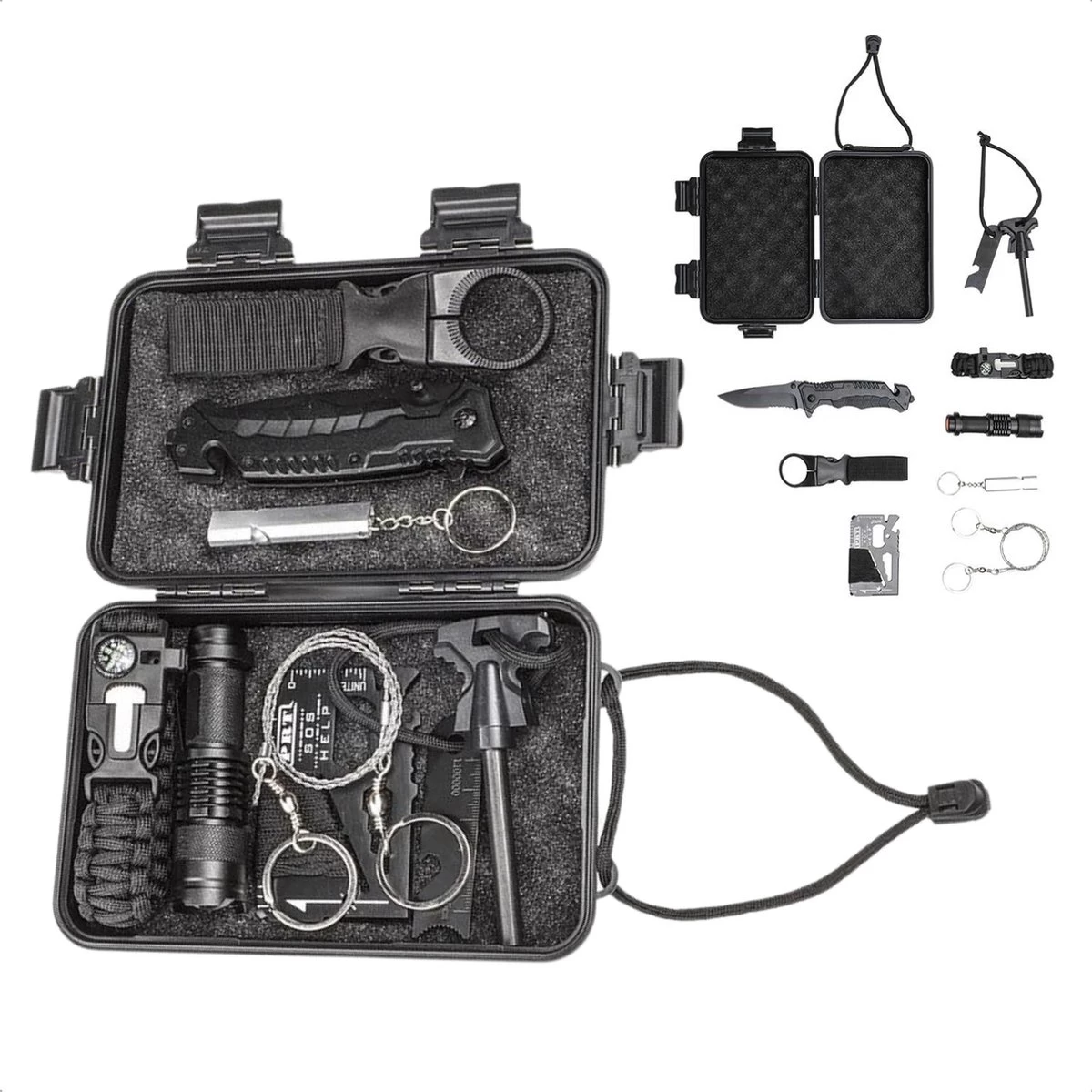 L’ensemble de survie Cheqo 9 pièces est un must pour tout aventurier. L’ensemble contient tout ce dont vous avez besoin pour survivre dans des situations extrêmes, comme un bracelet de survie multifonctionnel, un couteau de poche, une carte de survie et une lampe de poche. Tous ces éléments sont rangés dans une boîte compacte, résistante à l’eau et aux chocs aux dimensions de 17 x 10 x 5 cm et d’un poids d’environ 515 grammes.