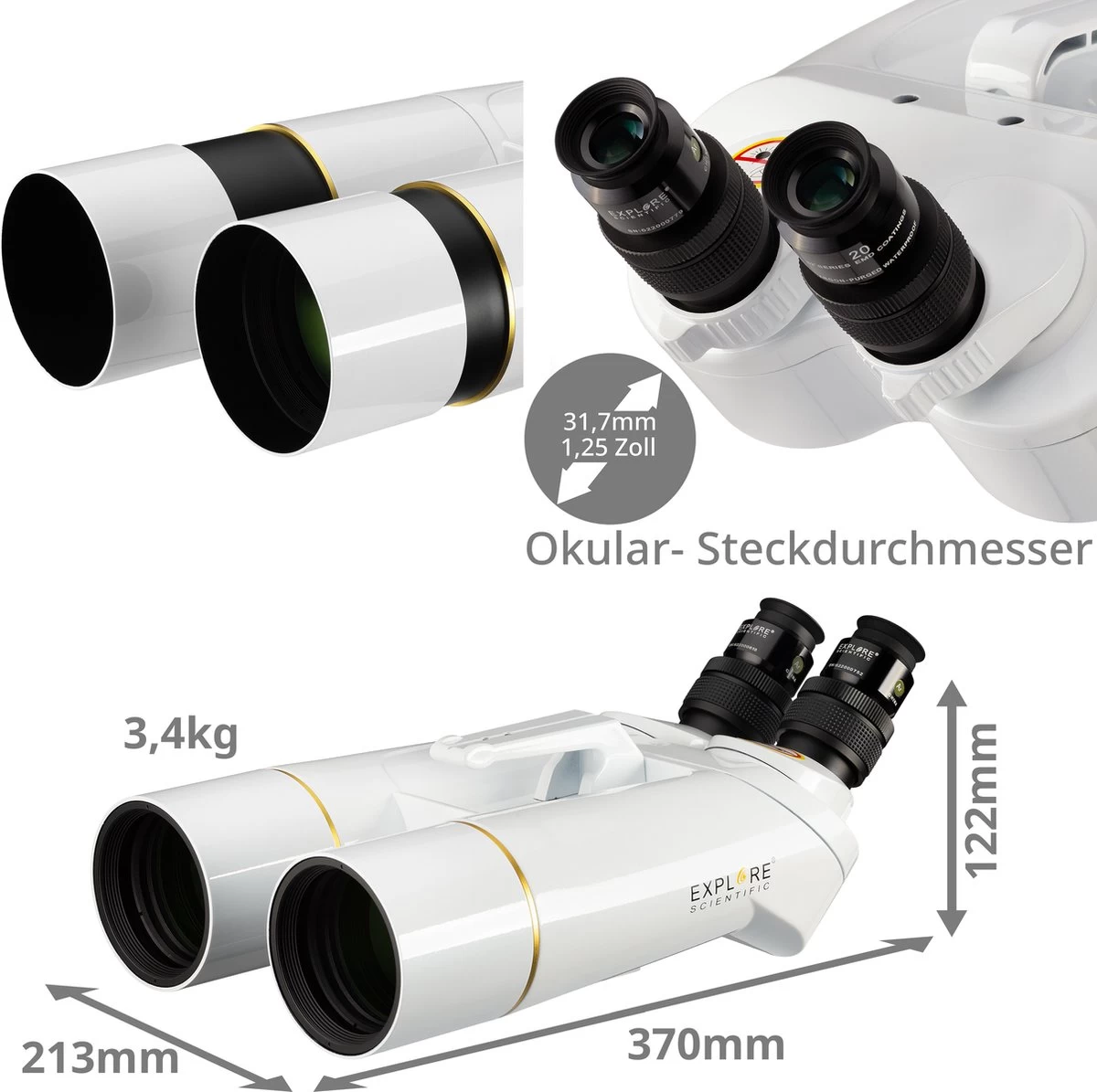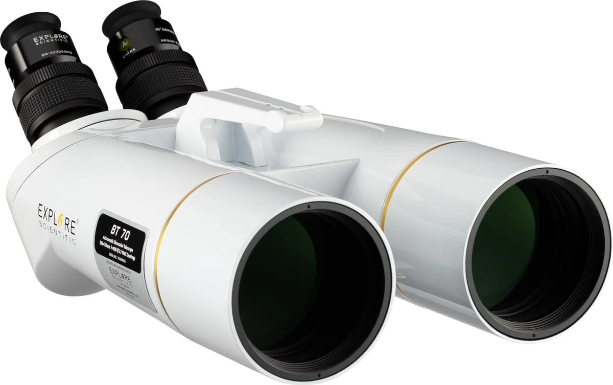 EXPLORE SCIENTIFIC est un fabricant établi d’oculaires de très haute qualité dans le monde astronomique depuis de nombreuses années. Un système optique est seulement aussi bon que son composant le plus faible. C’est pourquoi nous avons décidé d’équiper ces grandes jumelles d’une paire d’oculaires de qualité de la série 62 degrés LER. Avec un champ de vision de 62 degrés et une distance focale de 20 mm, les jumelles BT-70 produisent un grossissement de 20x. Ces oculaires grand angle offrent donc une très bonne vue d’ensemble à un grossissement modéré (champ de vision 3,1 degrés). Le grand dégagement oculaire de ces oculaires LER (Long Eye Relief) de 15 mm et les œilletons souples et pliables en silicone garantissent également une vision confortable et détendue. Pour l’astronomie, un champ de vision plat et net jusqu’au bord est avantageux et offre également une expérience d’observation très impressionnante pendant la journée. Grâce à la conception étanche et au remplissage en argon, ces oculaires sont absolument étanches et faciles à nettoyer.