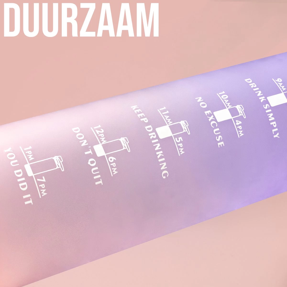 Une gourde idéale toute la journée. Cette gourde horodatée de 1L se transporte facilement dans la voiture, le cartable ou à la main. La bouteille d’eau est également très agréable à voir de par son design tendance ! La zone d’abreuvement est blindée et peut être ouverte facilement. Le marqueur de temps indique si vous avez assez bu. La bouteille d’eau facile à transporter est une bouteille d’eau idéale pour une utilisation quotidienne à l’école, au sport, en randonnée, en vacances et bien plus encore !