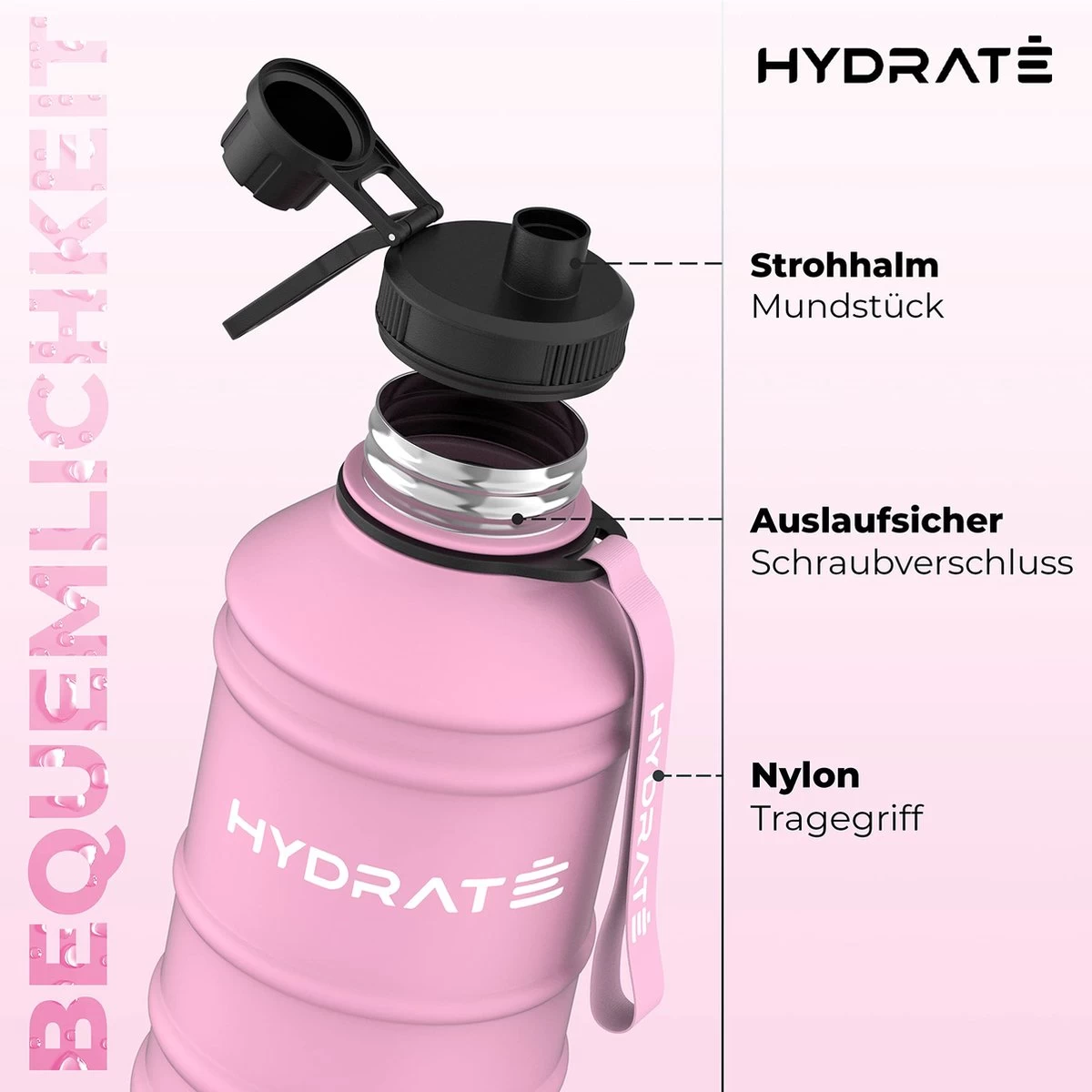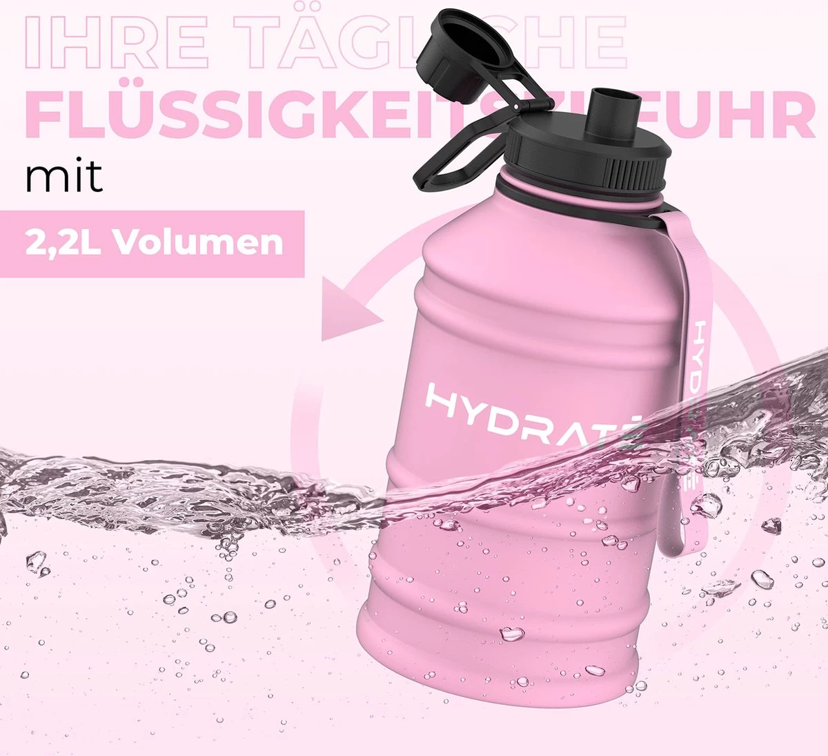 HYDRATE Bouteille D’eau En Acier Inoxydable – Bouteille D’eau De 2,2 Litres – Bouteille De Sport Sans BPA – Bouteille D’eau En Métal Sangle De Transport Pratique En Nylon Et Bouchon à Vis étanche, Bouteilles De Sport