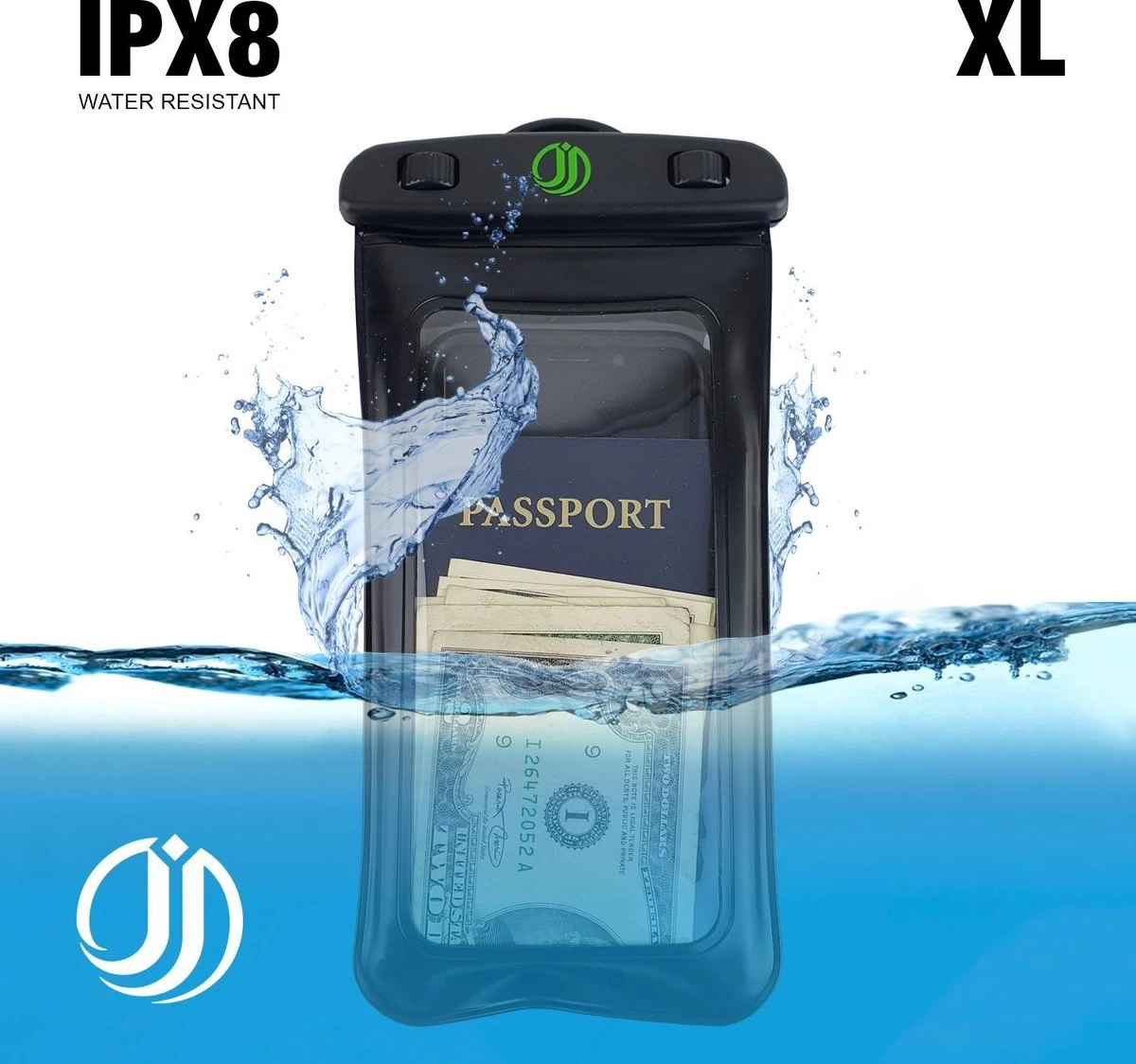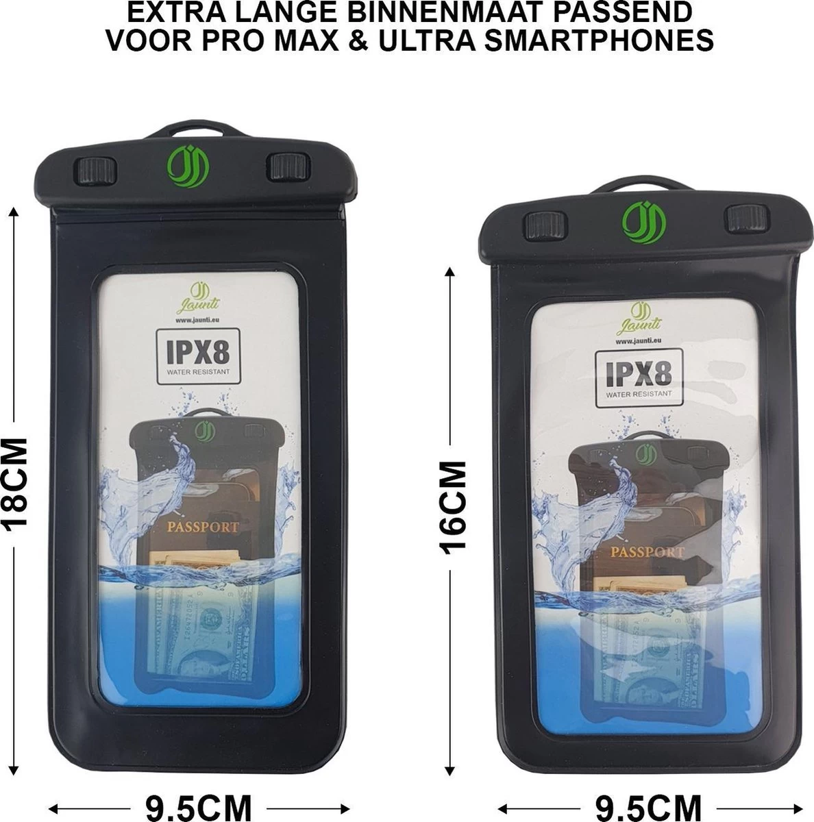 L’étui de téléphone résistant à l’eau appartient à la catégorie XL – variante en raison de la taille universelle. Cela signifie que tous les types de smartphones sont adaptés, y compris un passeport ou une carte de débit. La taille intérieure de la coque du téléphone est de 9,5 x 18 cm.