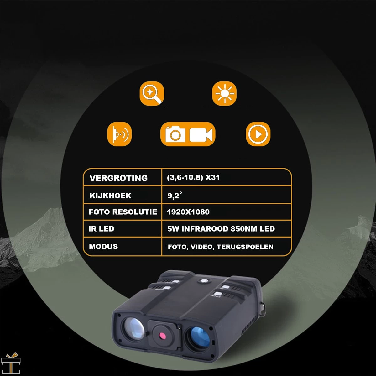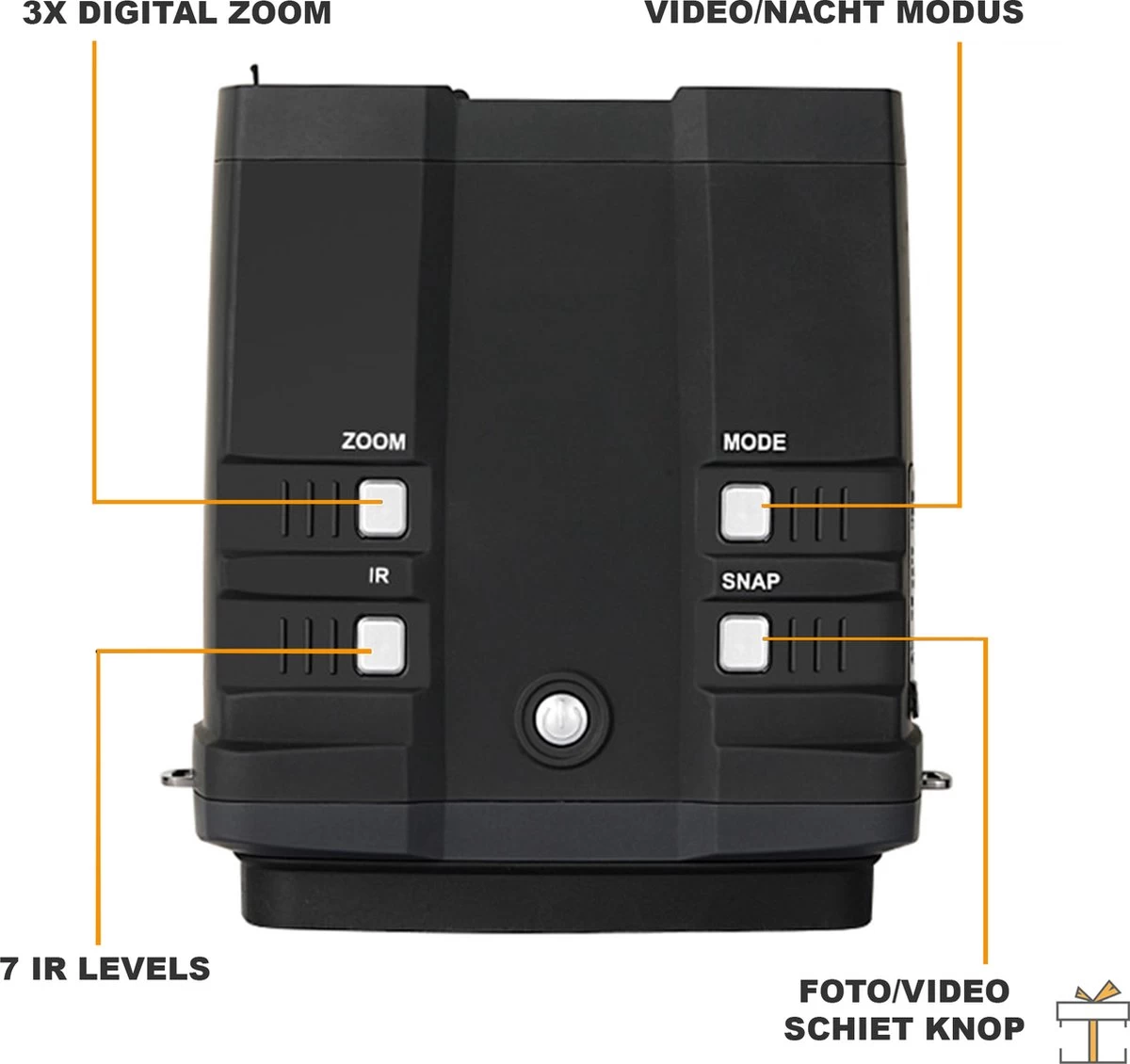 Allumez les lunettes de vision nocturne. Assurez-vous que le filtre infrarouge est au-dessus de l’ lens et commencez à regarder à travers le trou. Si vous êtes satisfait de ce que vous voyez, vous pouvez le laisser tel quel. Sinon, vous pouvez définir ce que vous voulez voir via le zoom et la fonction IR. Il y a 7 niveaux IR et un zoom numérique 3x intégré. Vous voulez prendre une photo ou une vidéo ? Au-dessus des jumelles se trouve un bouton où vous pouvez basculer entre photo et vidéo