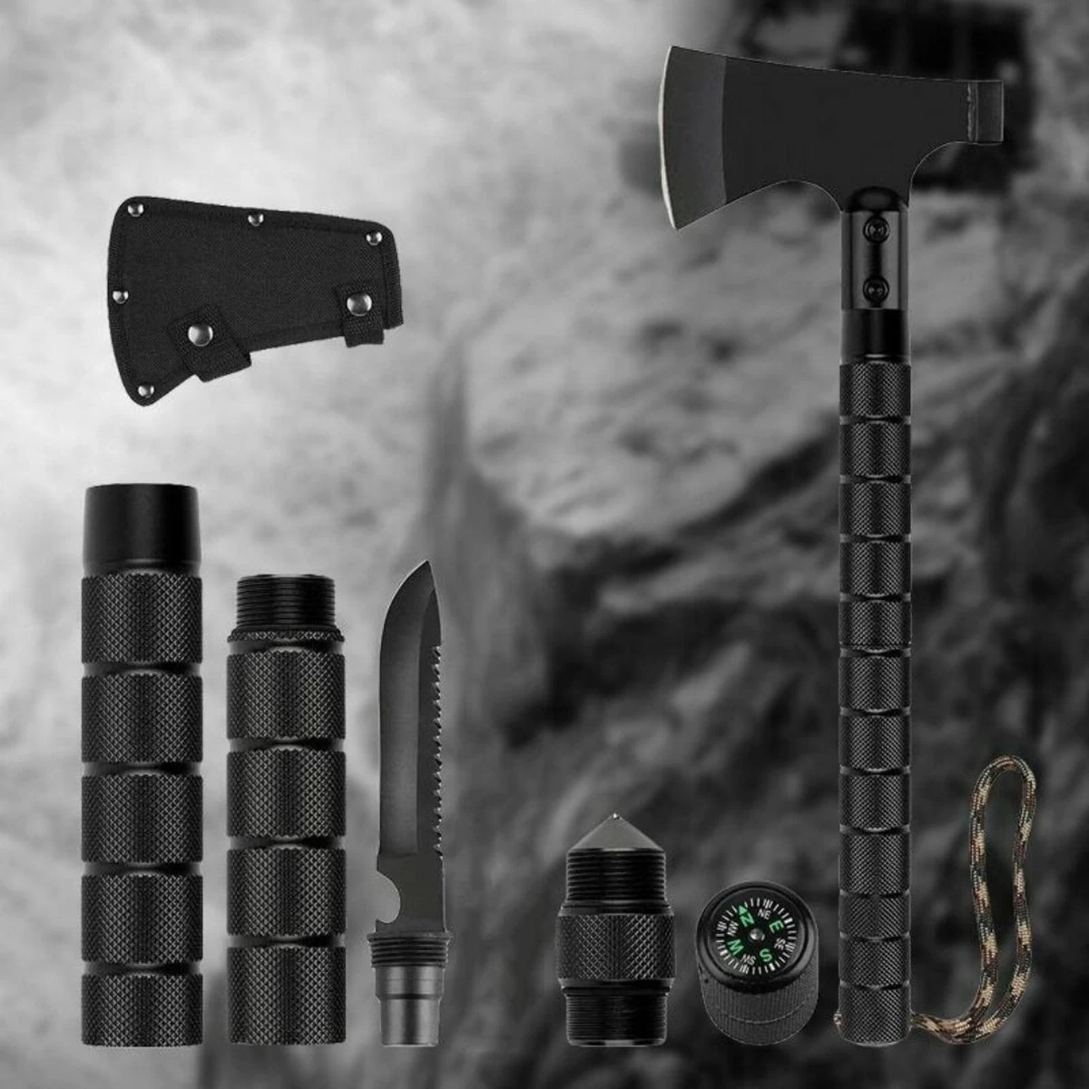 Avec la hache fendeuse, le marteau, le couteau de pêche, le sifflet d’urgence, la boussole et les extensions, cet ensemble est complet pour toute aventure !