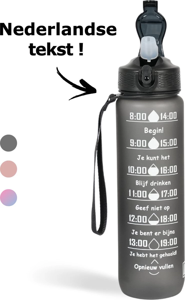Water est super saine. Cette bouteille d’eau vous permet de toujours boire suffisamment d’eau en une journée ! Les bouteilles d’eau Motivation de LaCardia garantissent que vous buvez suffisamment d’eau toutes les heures. Cela vous permet de boire 2 litres d’eau par jour. Vous n’avez qu’à remplir la bouteille deux fois grâce au grand réservoir d’un litre.