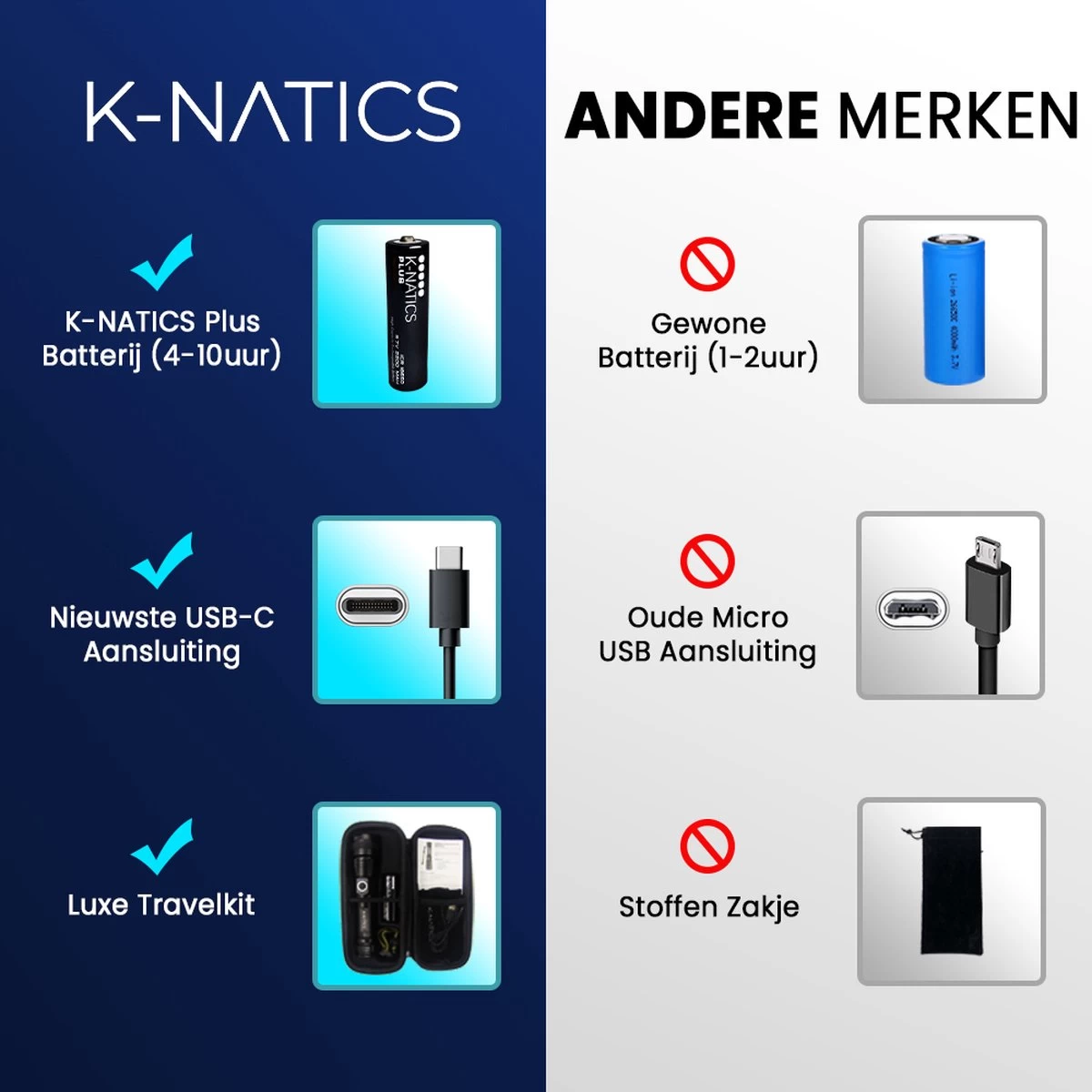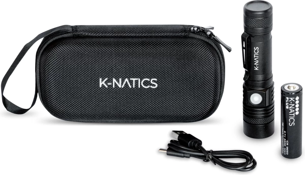 La LED de poche LED K-NATICS est livrée en standard avec notre très puissante batterie au lithium rechargeable K-NATICS SUPER 2200mAh. Cette batterie est beaucoup plus puissante que les batteries de lampes de poche comparables dans cette gamme de prix. Les LED pratiques indiquent exactement combien de temps durera la batterie. Avec le câble USB-C inclus, la batterie se charge en quelques heures et dure au moins 4-5 heures ! Une longue promenade en soirée ou une nuit entière de pêche ne pose donc aucun problème avec cette véritable centrale électrique.