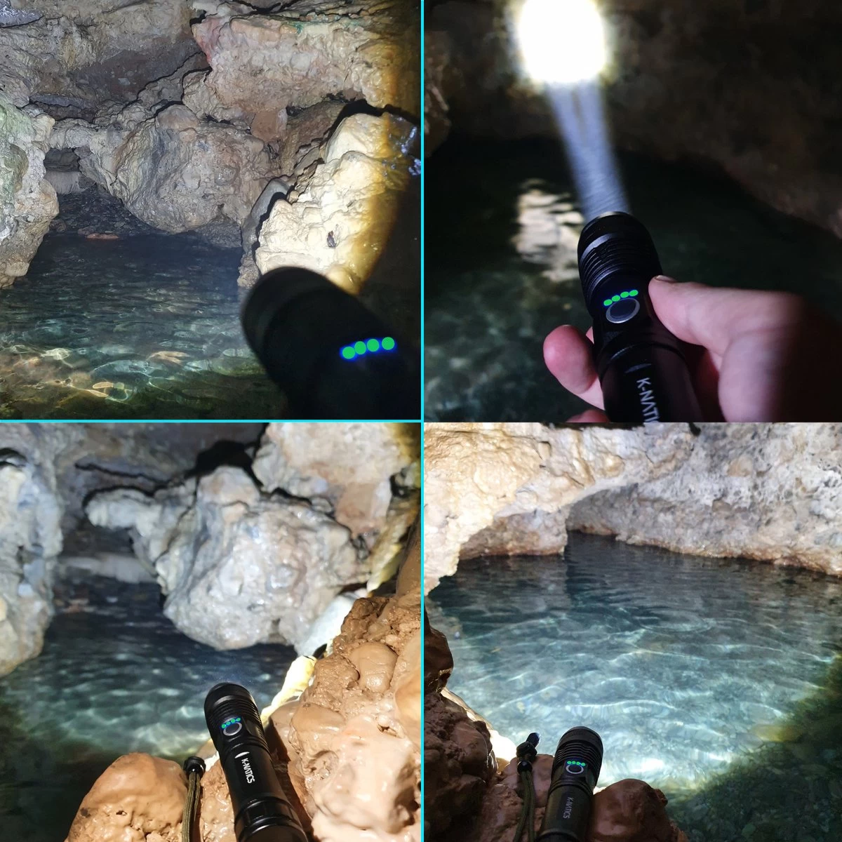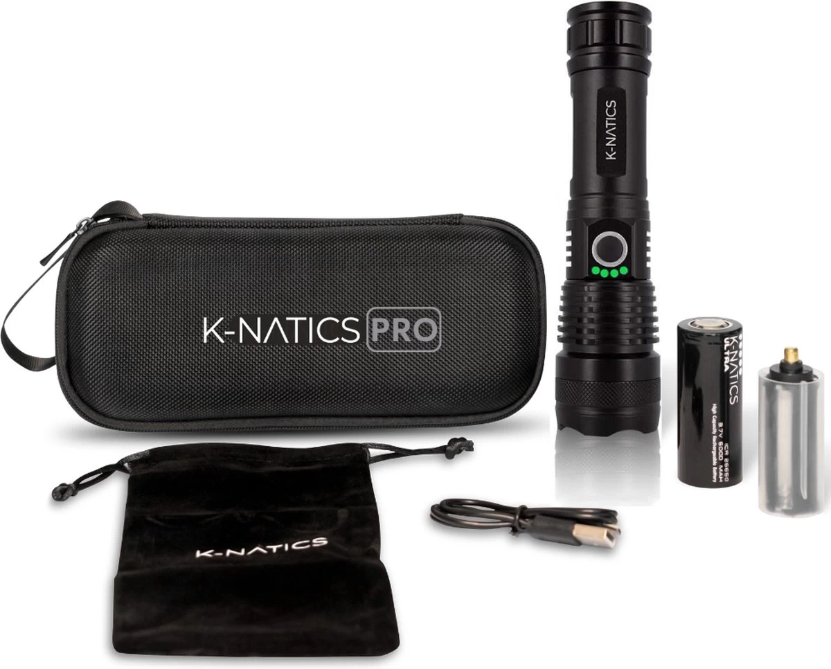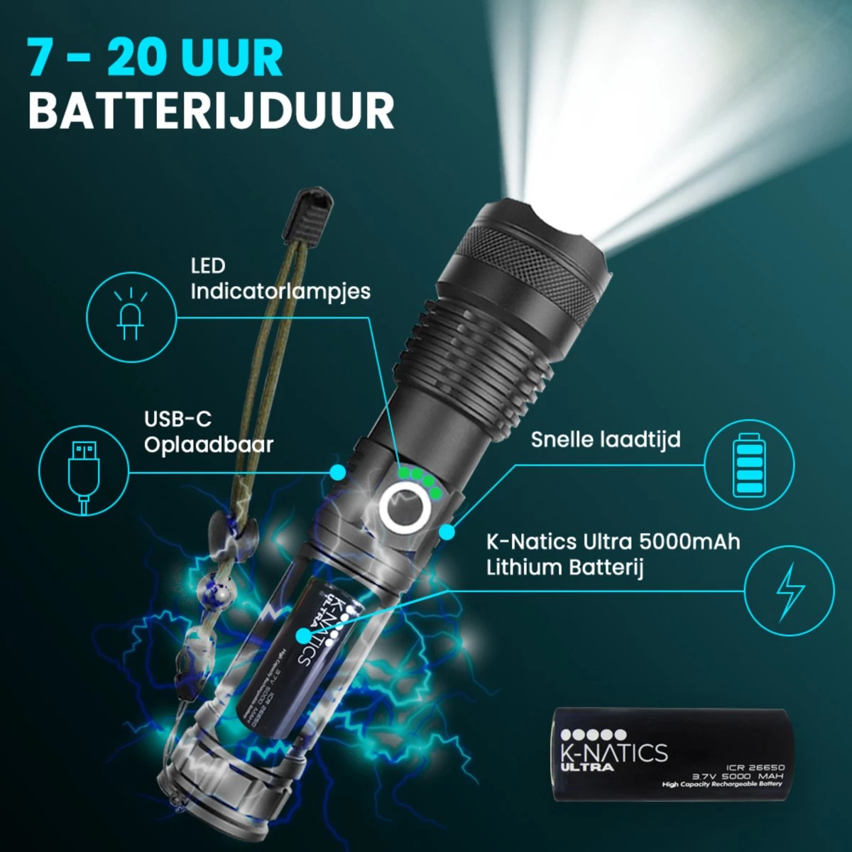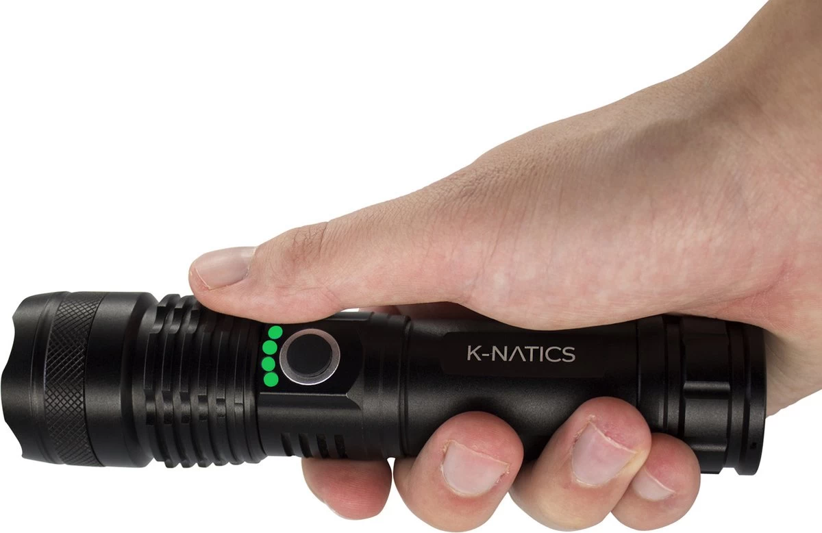 La LED de poche LED K-NATICS est livrée en standard avec notre très puissante batterie au lithium rechargeable K-NATICS ULTRA 5000mA. Cette batterie est beaucoup plus puissante que les batteries de lampes de poche comparables dans cette gamme de prix. Les LED pratiques indiquent exactement combien de temps durera la batterie. Avec le câble USB inclus, la batterie se charge en quelques heures et dure au moins 6 à 8 heures ! Une longue promenade en soirée ou une nuit entière de pêche ne pose donc aucun problème avec cette véritable centrale électrique.