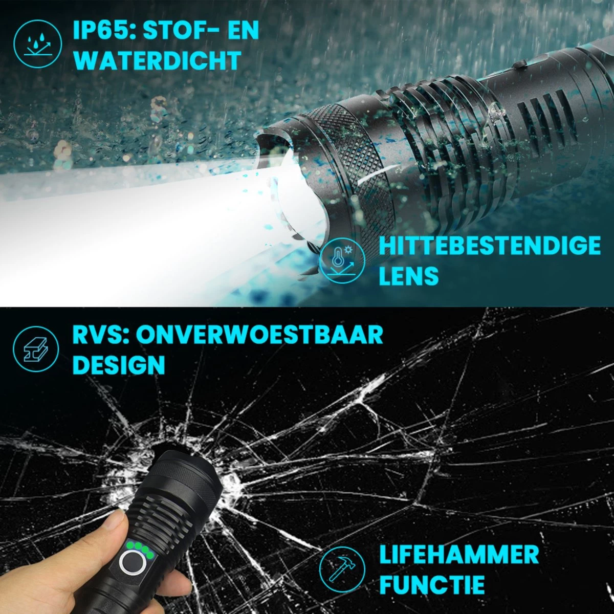 La lampe de poche est conçue pour un usage militaire et est donc indestructible, étanche à l’eau et à la poussière (IP-65). Il est fabriqué en aluminium aviation noir durable et solide. Si fort, en fait, que vous pouvez casser une fenêtre avec si nécessaire. Utilisez ce polyvalent pendant des vacances en camping, pendant la survie, avec des problèmes de voiture, en cas de panne de courant, de pêche de nuit ou pendant un travail. Grâce au design compact et au sac de rangement inclus, vous pouvez facilement l’emporter partout. En raison de son poids léger et de sa poignée ergonomique, la lampe de poche tient confortablement dans la main, même lors d’une utilisation prolongée.