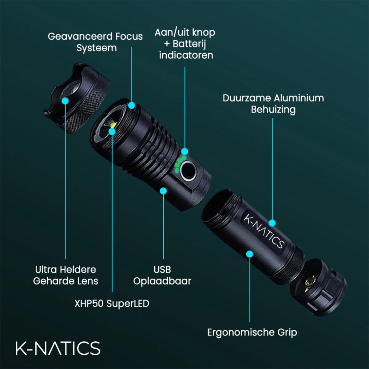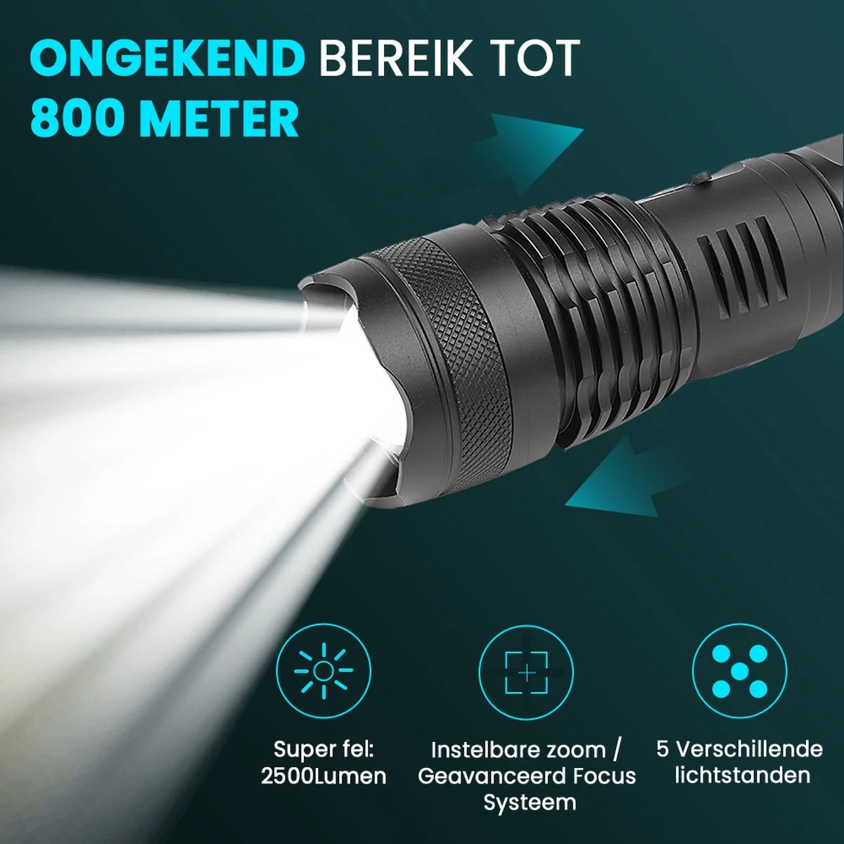 Avec la LED de poche LED K-NATICS F1280, vous n’aurez plus jamais peur du noir ! Brillez jusqu’à 1000 mètres avec cette lampe de poche rechargeable révolutionnaire ! Cette lampe de poche militaire étanche à la poussière et à l’eau K-NATICS a une puissance lumineuse de 3000 lumens dans sa position la plus lumineuse. Avez-vous complètement chargé la batterie K-NATICS 5000mA ULTRA fournie ? Ensuite, il dure pas moins de 6 à 8 heures dans son cadre le plus lumineux ! Ne vous inquiétez jamais de rester coincé dans le noir pendant votre promenade nocturne ou votre voyage de survie. En plus de la batterie ultra-résistante, cette lampe de poche est livrée dans un étui en mousse robuste, une pochette de rangement pratique et un câble de chargement USB.
