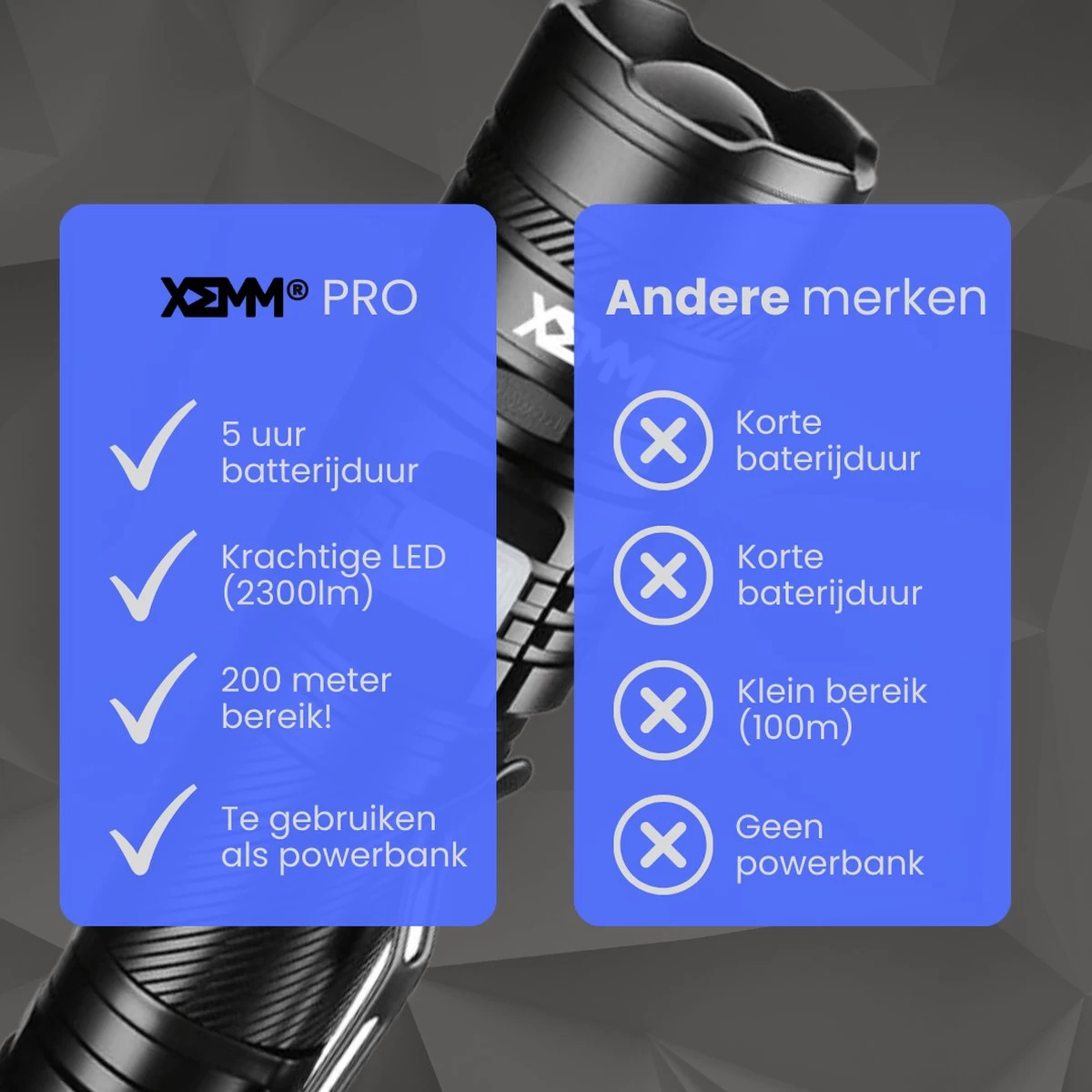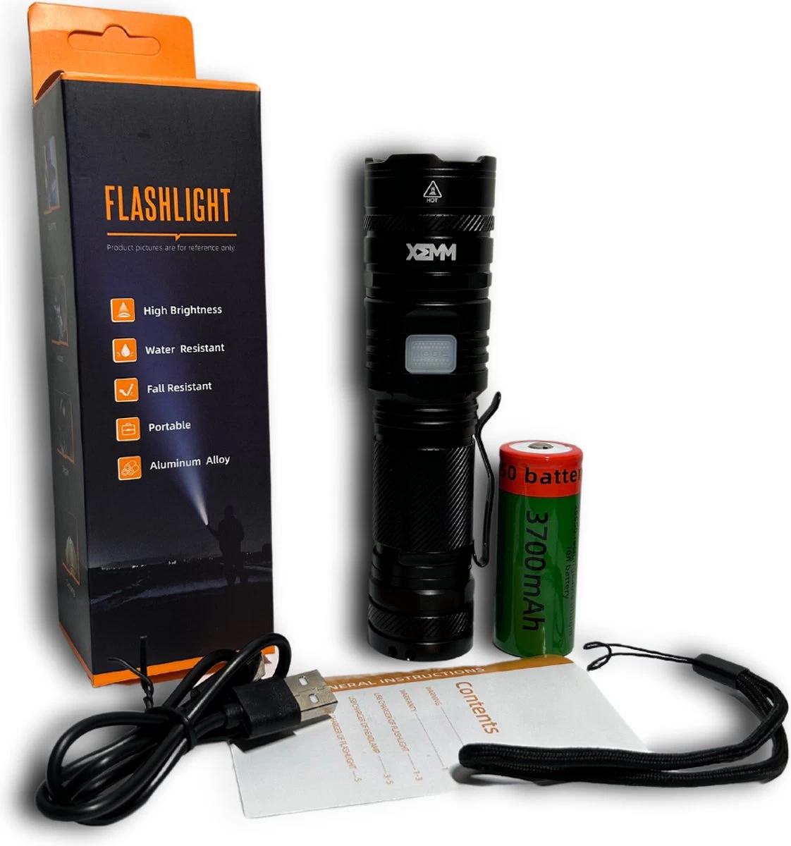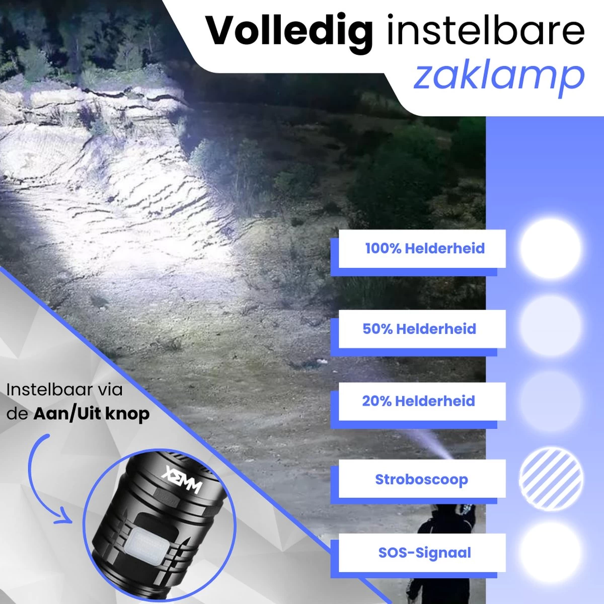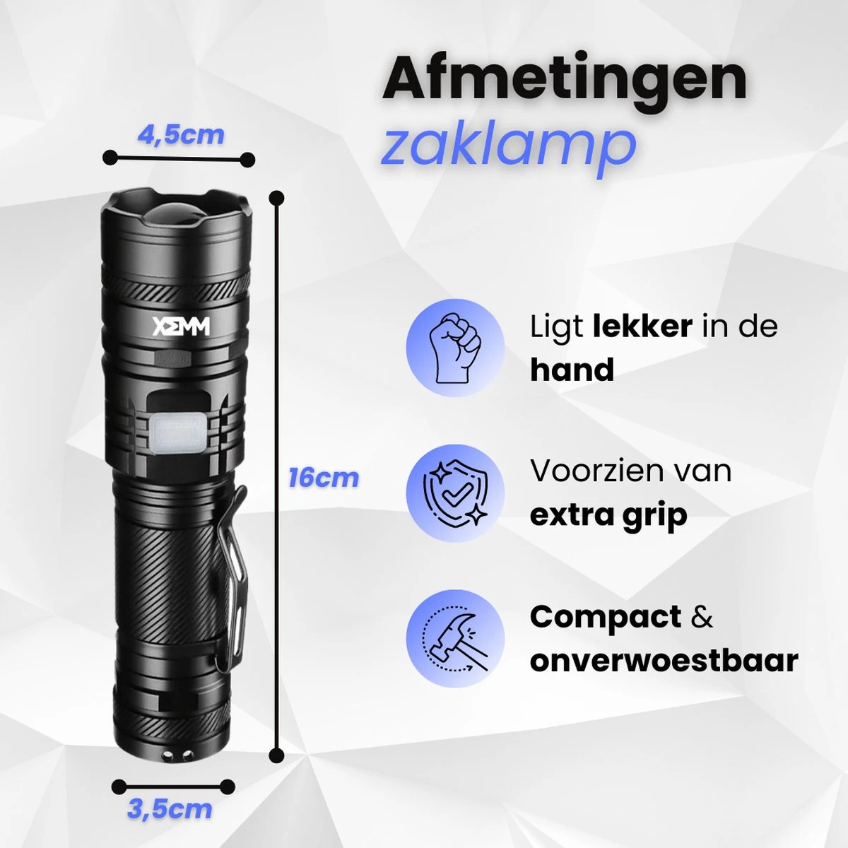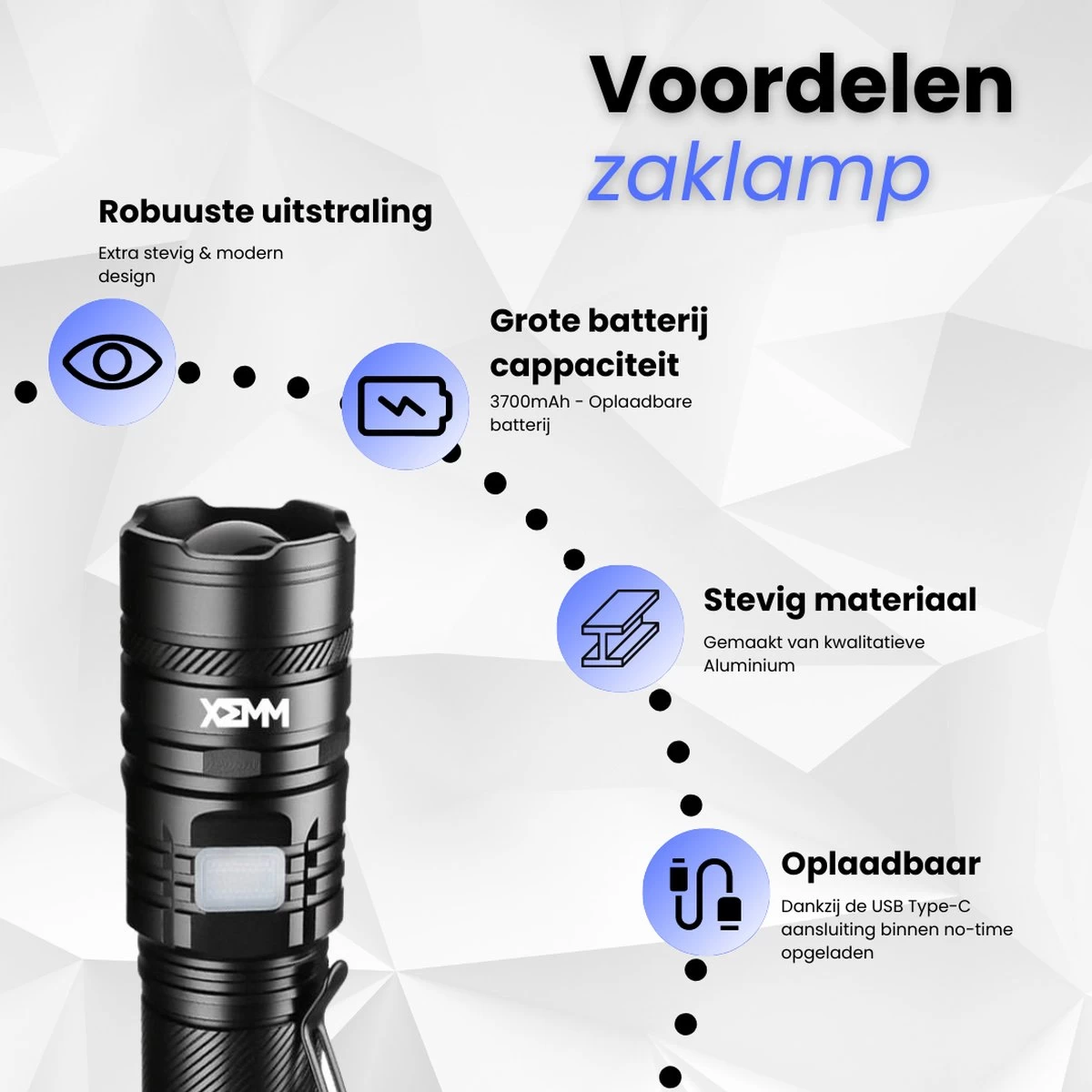 Ben -vous déjà peur du noir ou êtes-vous souvent occupé par une promenade nocturne ? Alors la lampe de poche XEMM® PRO est la solution parfaite. Avec cette lampe de poche outdoor , vous pouvez briller jusqu’à 500 mètres ! La lampe de poche rechargeable robuste a également une puissance lumineuse maximale de 2300 lumens et la lampe est étanche à la poussière et à l’eau. Voulez-vous profiter de la grande lampe de poche performante aussi longtemps que possible ? Ensuite, chargez complètement la batterie puissante de 3700 mAh incluse et profitez de la longue durée de vie de la batterie de pas moins de 5 heures ! Avec cette lampe de poche, vous ne devez jamais vous perdre dans l’obscurité en camping. En plus de la batterie extrêmement puissante, un cordon pour votre poignet et un câble de charge USB-C sont également inclus.