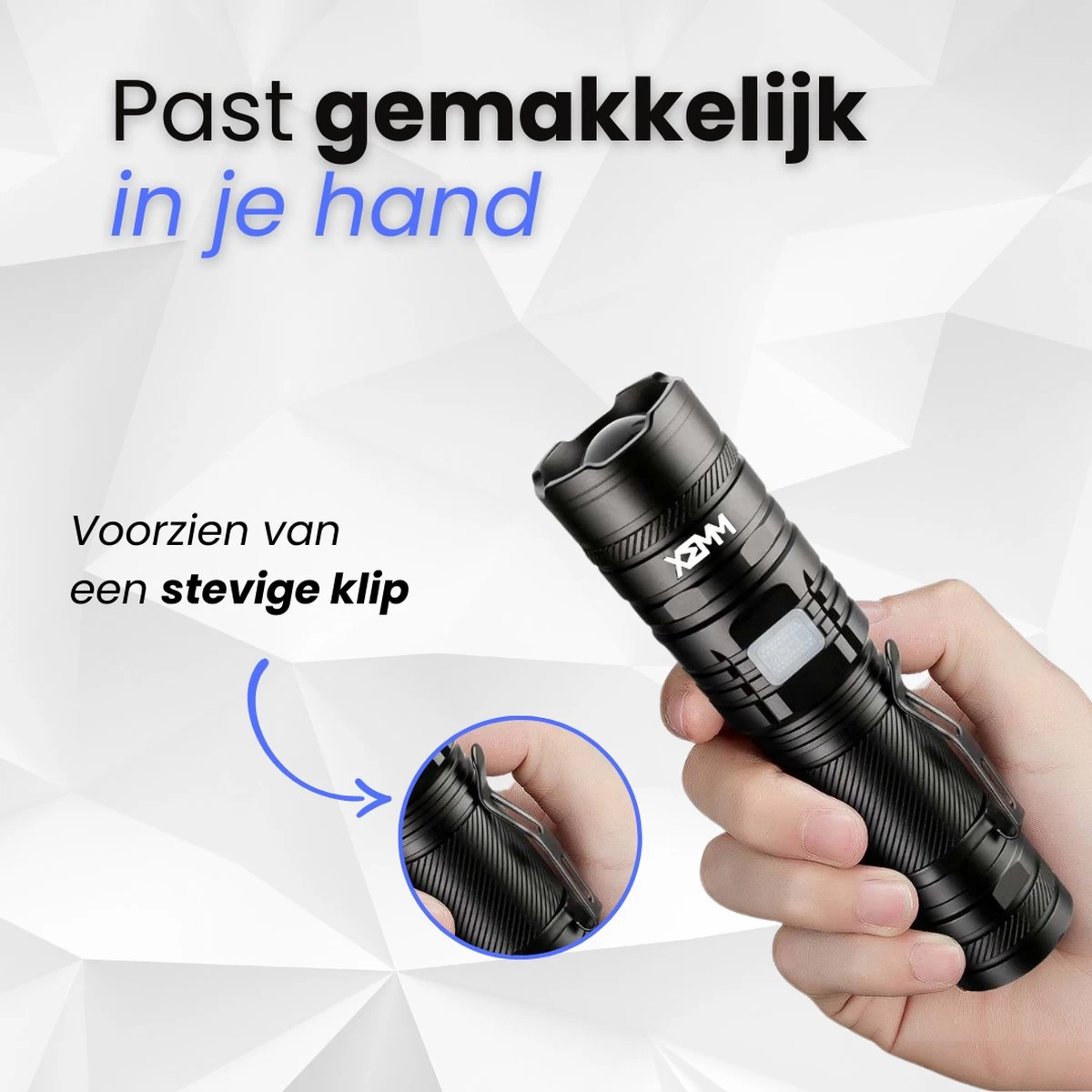 La lampe de poche est équipée d’un total de 5 modes d’éclairage différents, dont 3 intensités lumineuses, un stroboscope et une fonction SOS. L’intensité lumineuse est facile à régler en basse, moyenne et haute. Pour changer le mode d’éclairage, vous devez cliquer une fois sur le bouton. Appuyez sur le bouton et maintenez-le enfoncé pendant 2 secondes pour éteindre la lampe. La lampe tactique est également équipée d’un système de mise au point avancé avec zoom réglable. Cela vous permet de regrouper facilement la lumière, de sorte que vous puissiez briller encore plus loin et plus lumineux.
