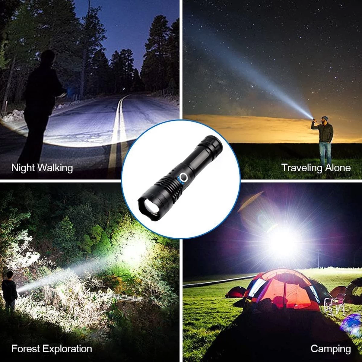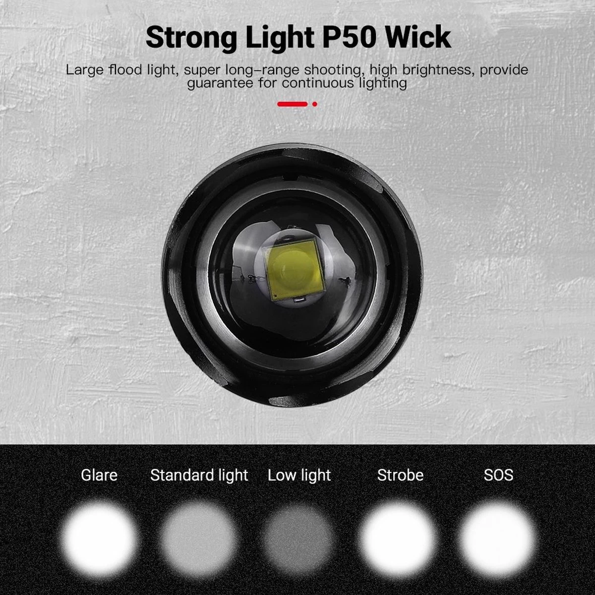 La lampe de poche LED rechargeable a5 modes d’éclairage , y compris le mode haute lumière, le mode lumière modérée, le mode faible lumière, SOS et le mode flash. Il peut répondre à vos différents besoins dans différents environnements.