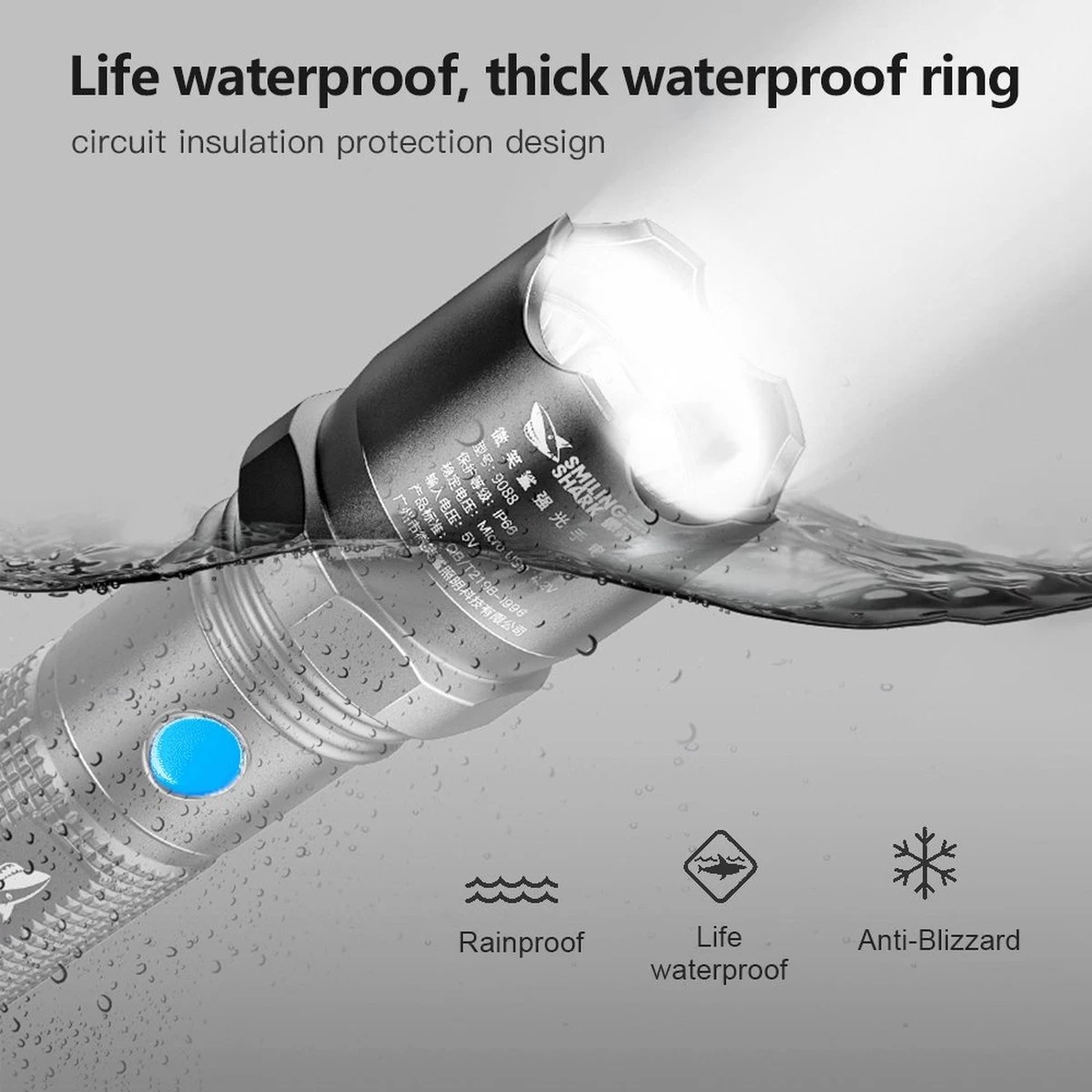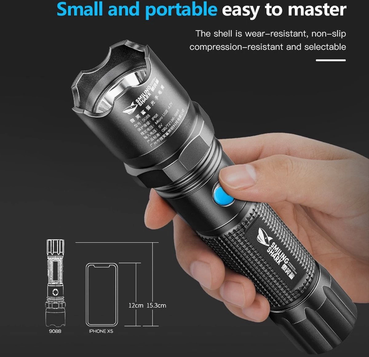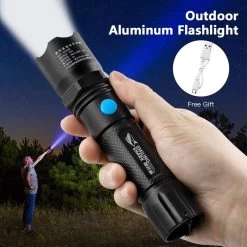 La lampe de poche LED rechargeable Zacro, fabriquée en ABS durable et avec une tête annulaire rainurée est robuste et solide, elle est assez solide pour casser les vitres de la voiture en cas de danger. Ampoule LED- plus lumineuse et plus efficace qu’une ampoule à incandescence typique. L’étanchéité IP66 fait briller la lampe de poche même les jours de pluie, 12 000 lumens super lumineux, idéal pour le camping en plein air et les urgences à domicile. La lampe de poche tactique a les modes Strong, Normal et Stroboscope qui sont contrôlés en appuyant sur le bouton bleu de la lampe de poche, très facile et pratique à utiliser. Le port de charge USB intégré permet une charge sûre via un adaptateur voiture/mural. Il peut également être utilisé comme banque d’alimentation portable pour recharger votre téléphone en cas d’urgence.