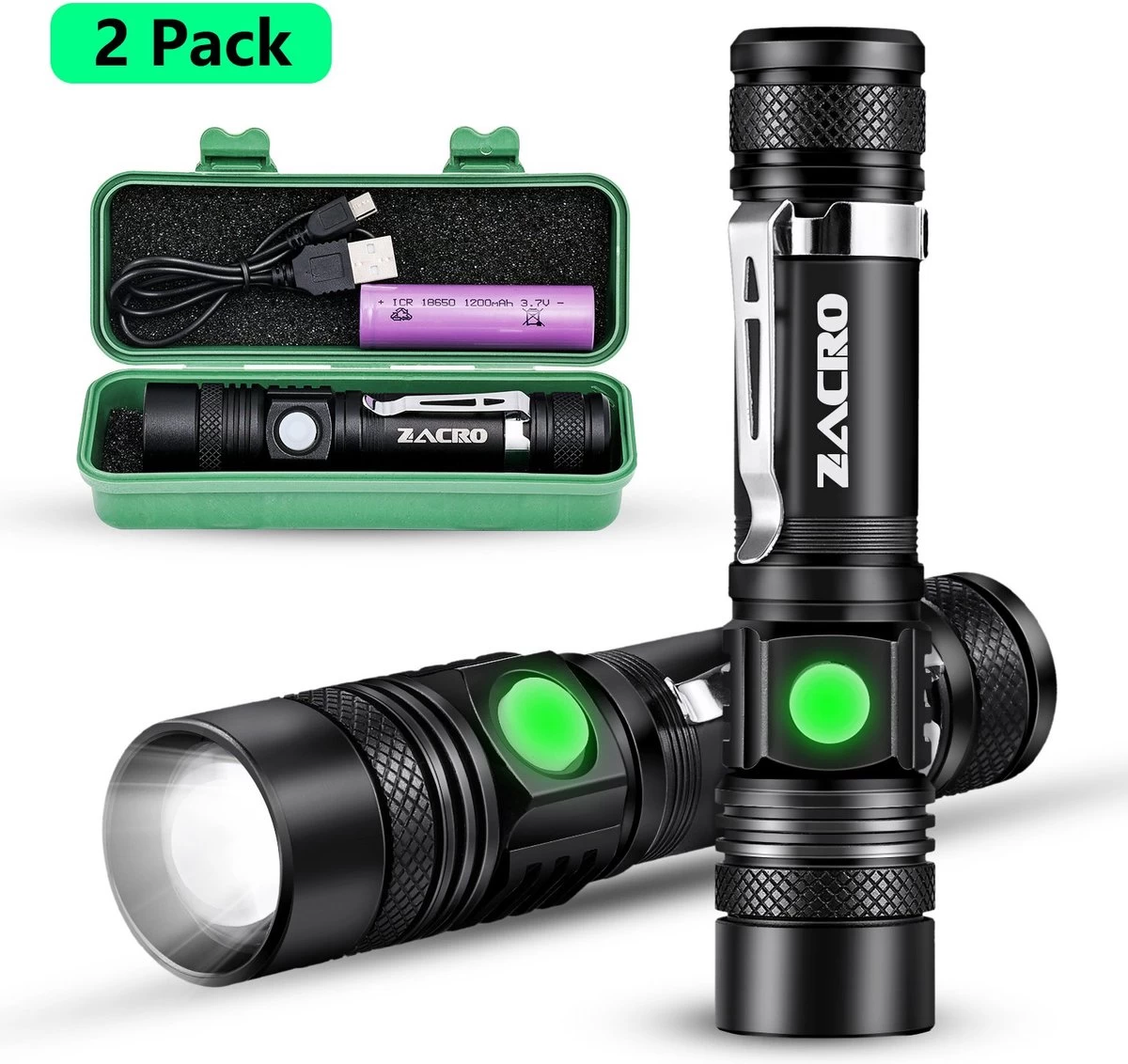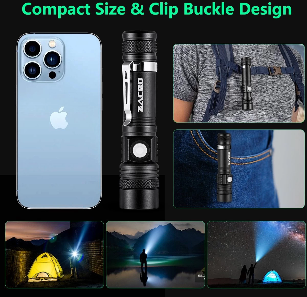 La lampe de poche LED rechargeable Zacro 2 pack adopte des puces LED T6 de mise à niveau, elle peut facilement éclairer une pièce de 750 mètres carrés ou se concentrer sur des objets jusqu’à 200 m.