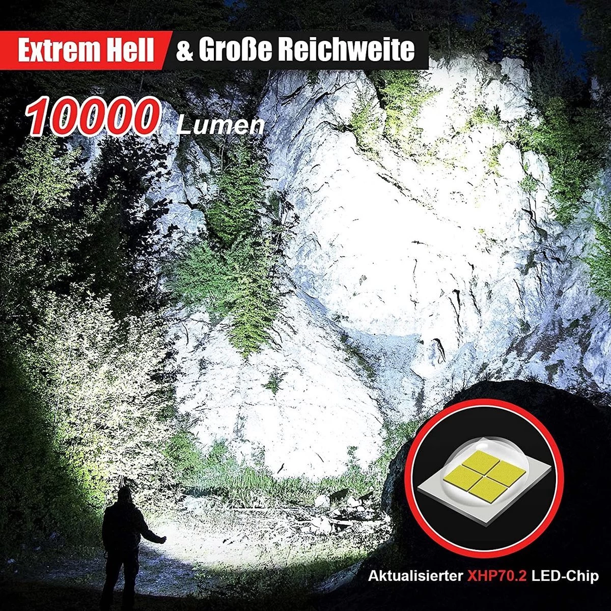 La puce LED avancée XHP70.2 intégrée dans la lampe de poche tactique, une lumière stable et lumineuse, elle peut facilement éclairer tous les coins de tout le jardin. 10 000 lumens, la lumière du jour 8 000 K peut illuminer les choses à moins de 500 m, vous permettant de l’utiliser comme lampe de poche tactique. Il est 10 fois plus lumineux qu’une lampe de poche normale.