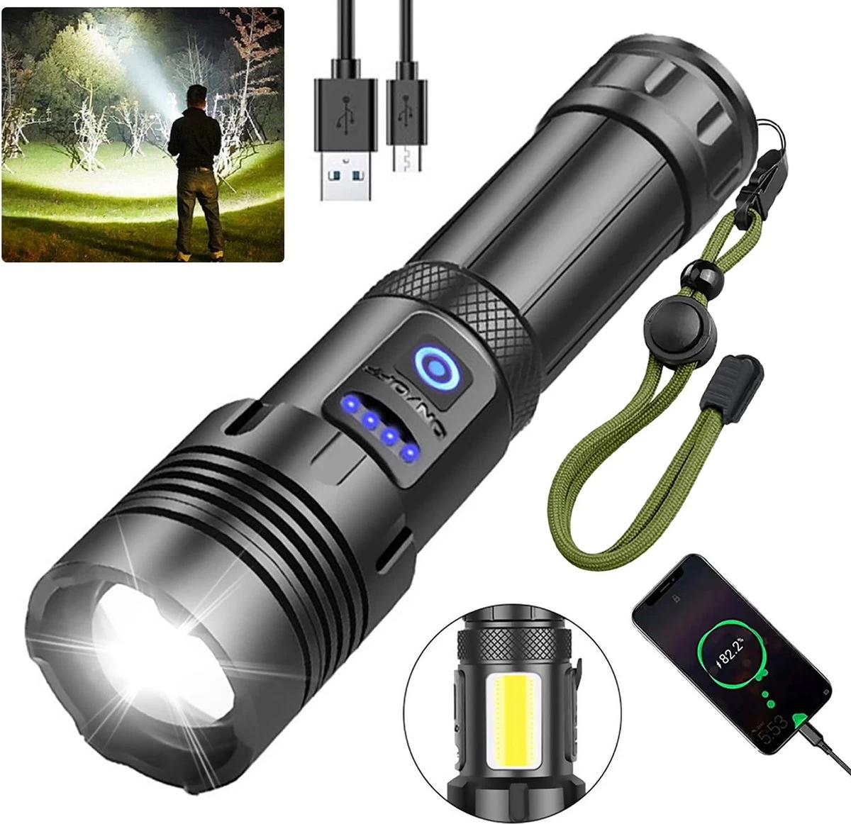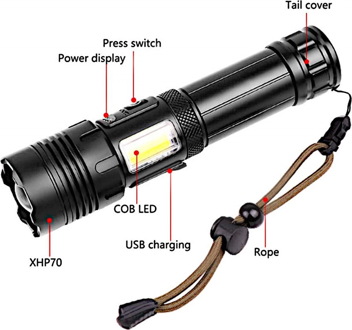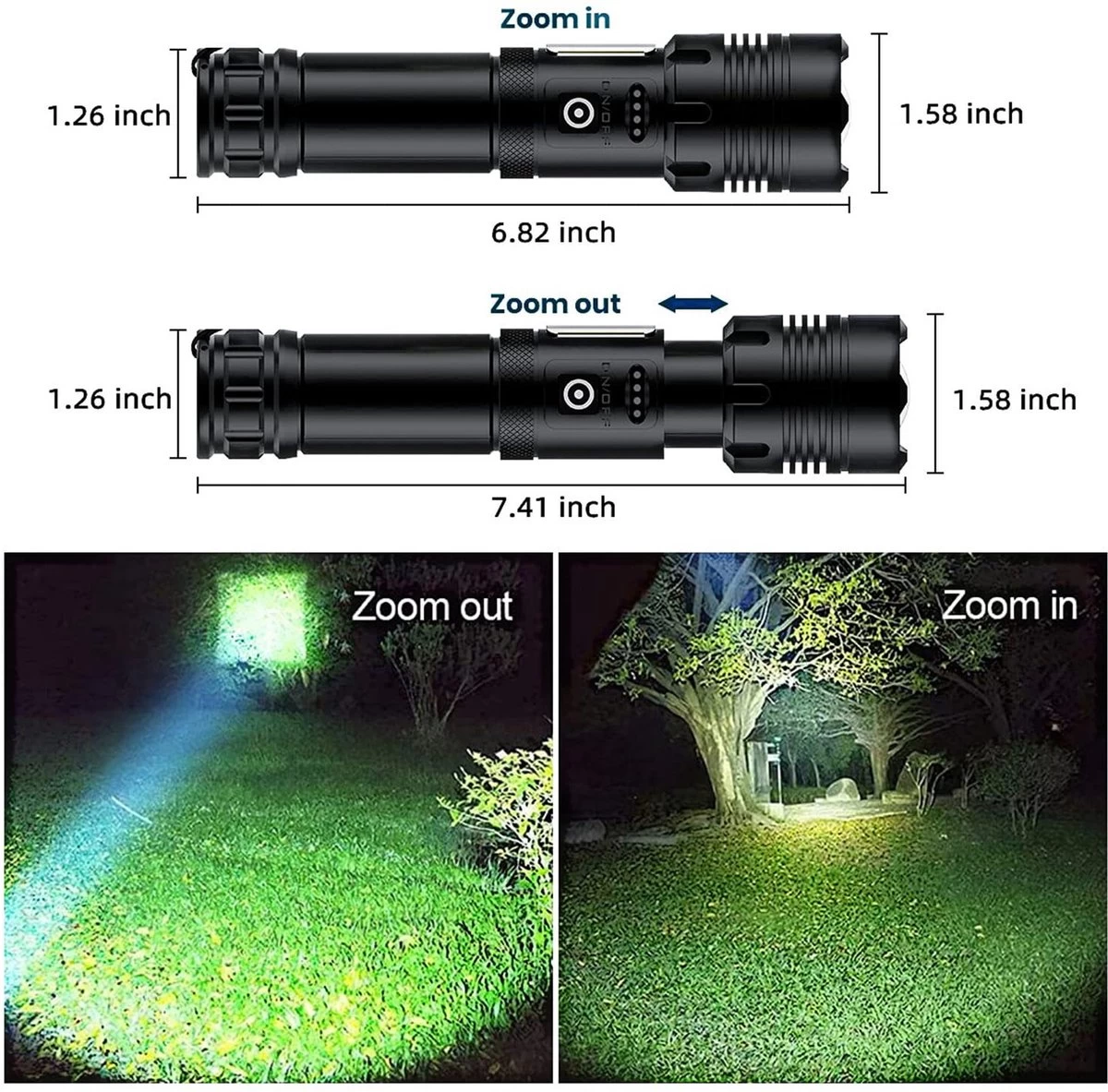 Lampe de poche LED rechargeable Zacro de haute qualitéalliage d’aluminium , il est durable et résistant à l’eau, il permet une utilisation pratique dans diverses conditions météorologiques extrêmes. Lampe de poche LED rechargeable avec une puissance élevée allant jusqu’à 100 000 lumens, une irradiation sur une grande surface et une distance d’irradiation jusqu’à500 mètres .