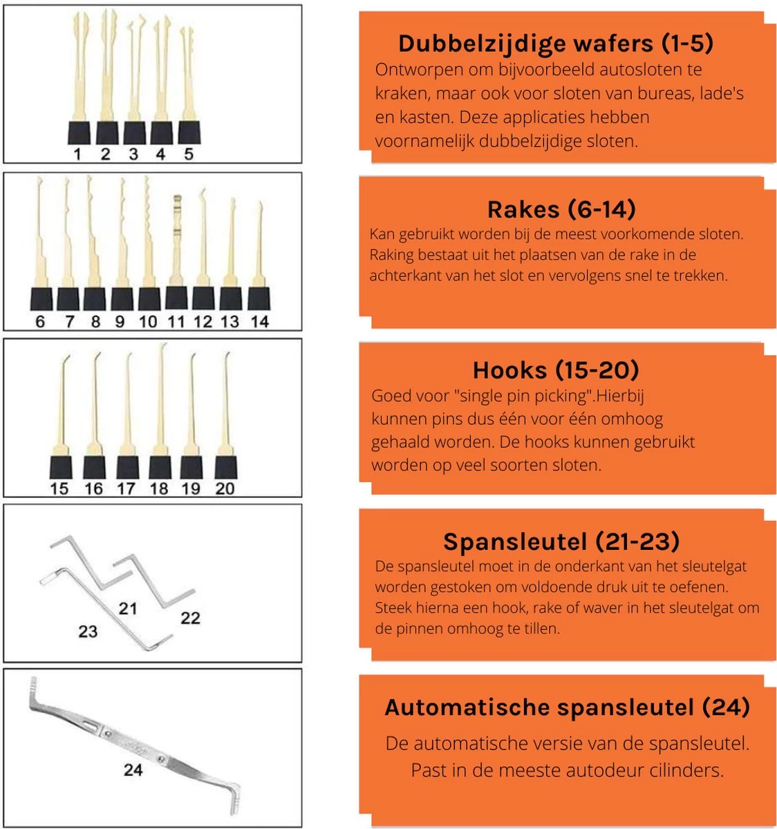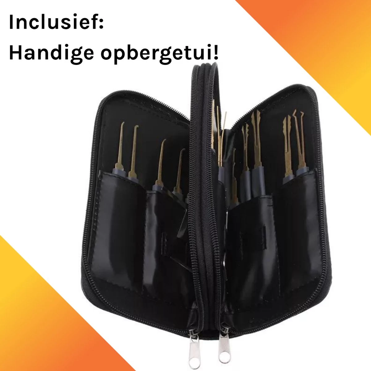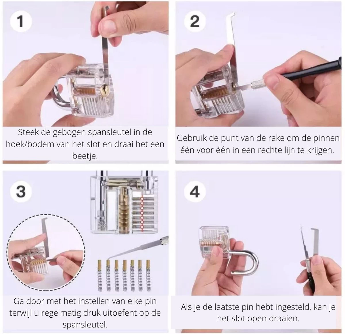 L’ensemble de crochetage est pour tout le monde, des jeunes aux moins jeunes et des débutants aux professionnels. Il contient suffisamment d’outils pour casser un large éventail de serrures. De plus, il y a aussi 2 verrous transparents sur lesquels s’entraîner. Un cadenas pour les débutants et une serrure à double cylindre pour les plus avancés.