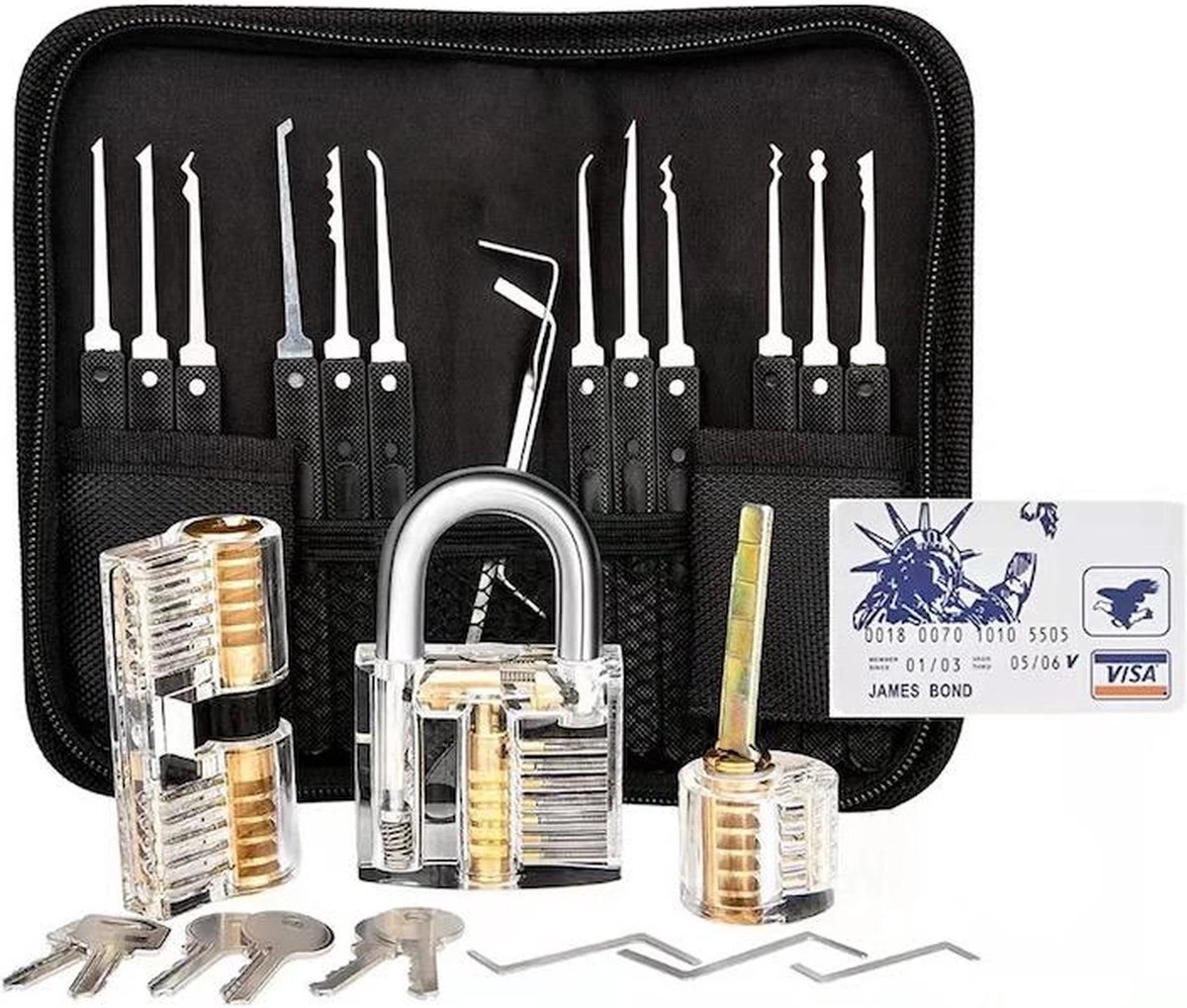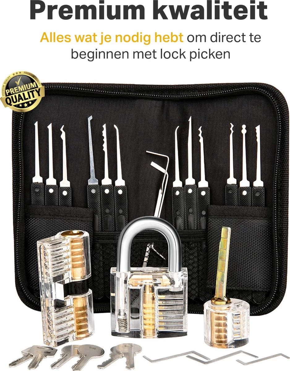 L’ensemble se compose de 27 pièces et est donc très vaste. De cette façon, vous pouvez commencer tout de suite et passer des heures à vous débrouiller pour améliorer vos compétences. Les trois serrures d’entraînement vous apprennent à manipuler différents types de serrures et sont transparentes pour que vous puissiez suivre vous-même toutes vos étapes.