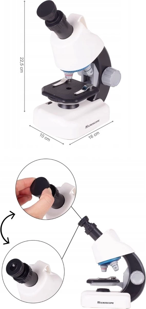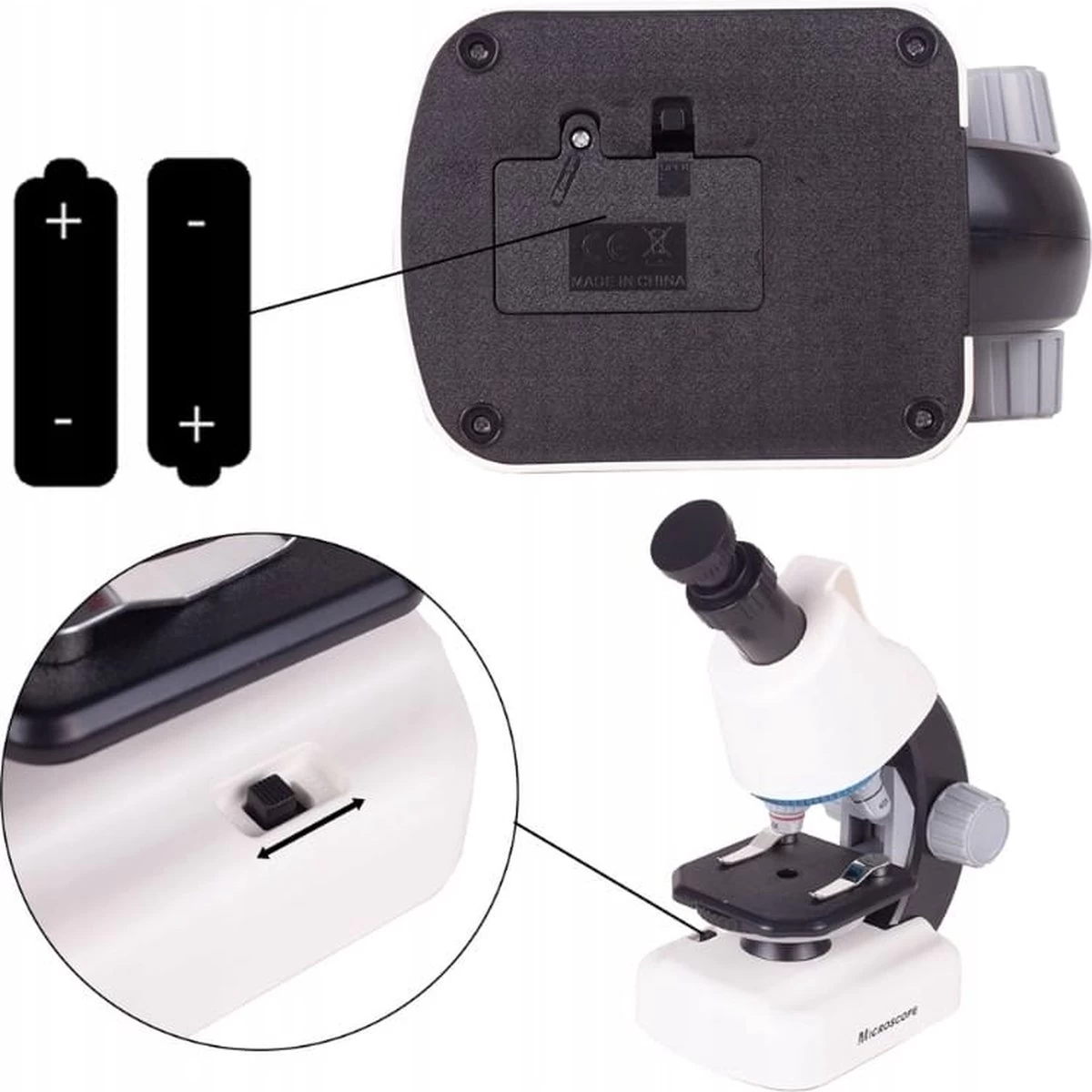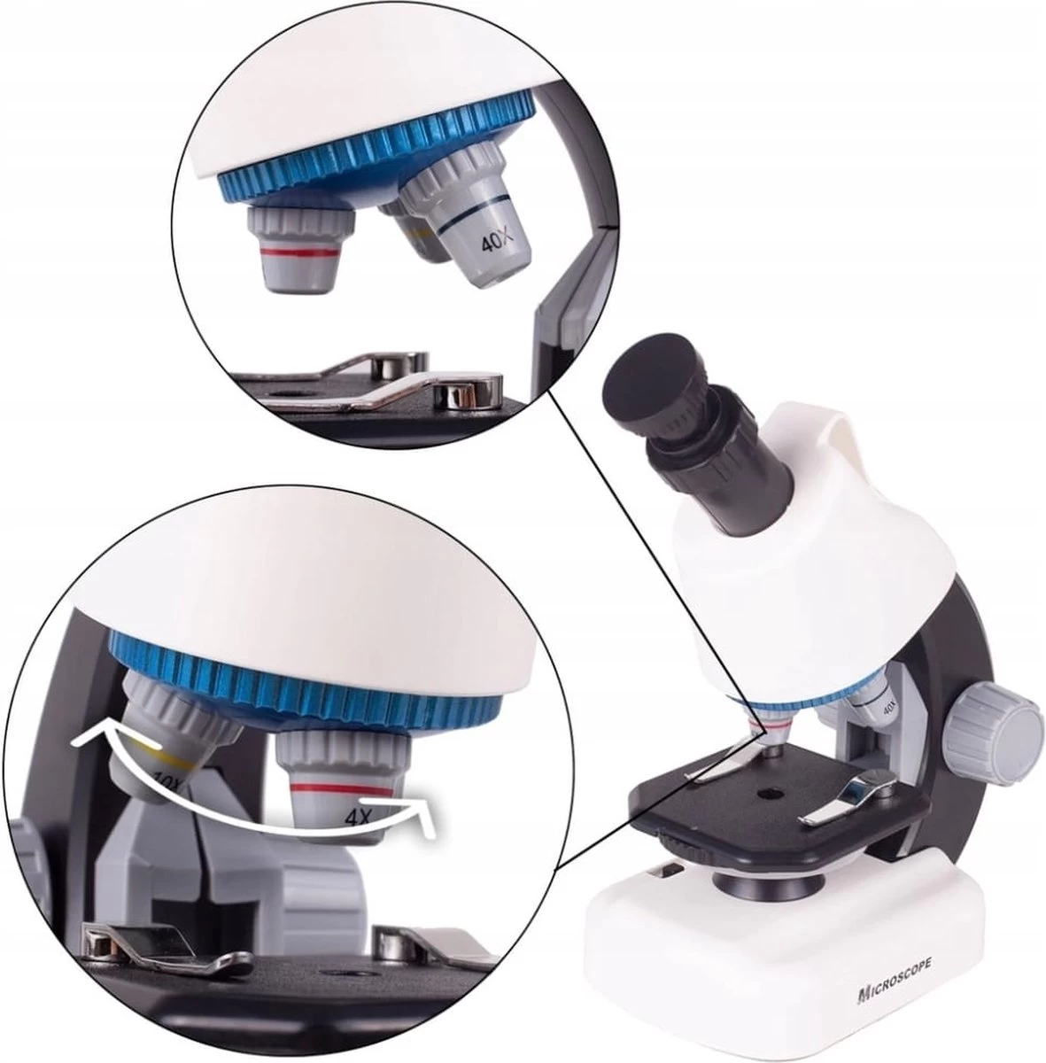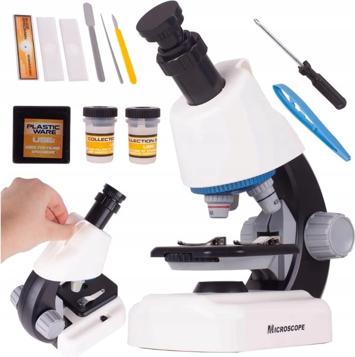 Le petit microscope de laboratoire est parfait comme cadeau pour les petits scientifiques qui aiment observer des choses qui ne peuvent pas être vues à l’œil nu. Grâce au microscope, l’enfant apprendra à connaître le monde qui nous entoure de plus près que d’habitude. Le microscope introduira le petit explorateur dans le monde merveilleux de la microbiologie, de la science et de la nature. Le microscope dispose d’un oculaire rotatif à 360°, de trois types de grossissements 4x/10x/40x et d’une lumière intégrée pour éclairer les préparations visualisées.L’ensemble est très soigneusement et précisément fabriqué entièrement en plastique.Il fonctionne avec 2 piles AA ( non inclus ). Le microscope a tout ce dont vous avez besoin pour voir le micro-monde.