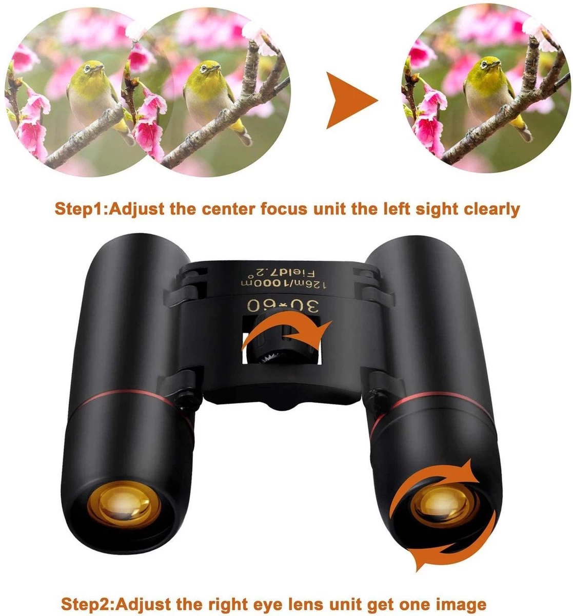 1. Fermez votre œil gauche et regardez un objet avec votre œil droit, mettez au point les jumelles en tournant la molette de mise au point centrale jusqu’à ce que l’image soit nette et claire. Si l’œil droit est bien focalisé, vous pouvez utiliser les deux yeux et, si nécessaire, affûter légèrement les jumelles ou élargir ou raccourcir les jumelles jusqu’à ce que les deux yeux obtiennent une image.