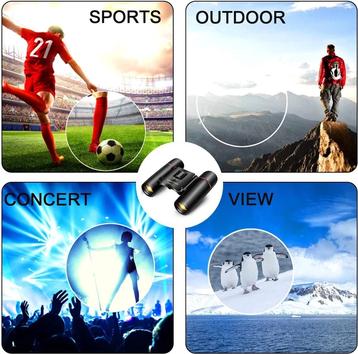 Applications: extérieur, observation des oiseaux, escalade, randonnée, visites touristiques, voyages, sports, jeux, concerts, etc.