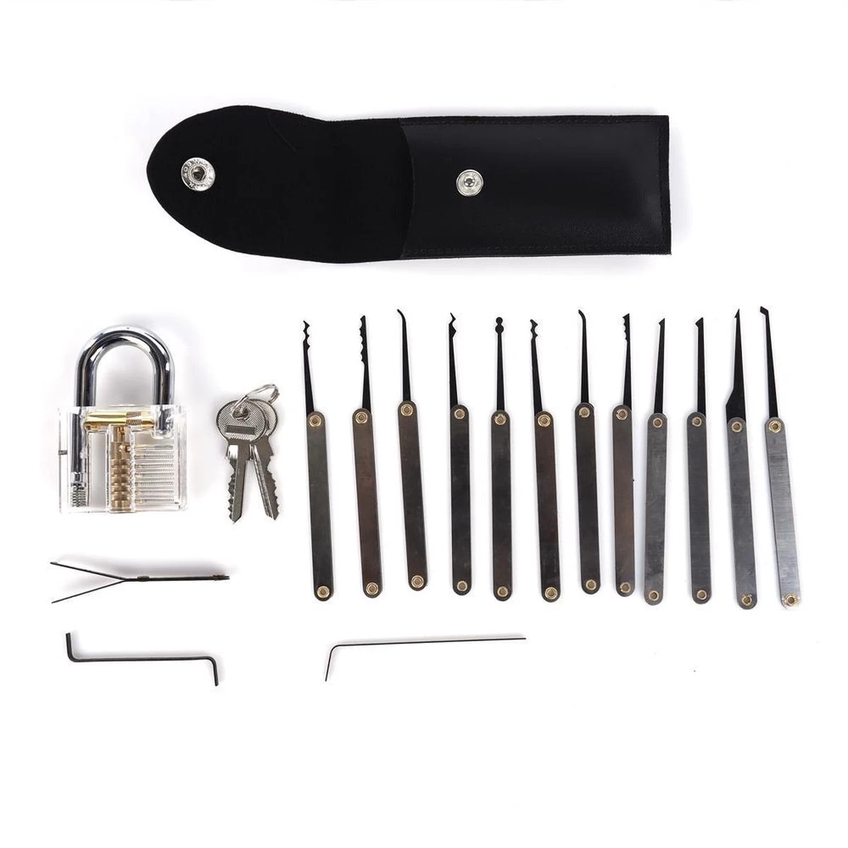 Avec cet ensemble de crochetage, vous pouvez apprendre comment fonctionne le crochetage. Le verrou d’entraînement transparent vous permet de voir exactement ce qui se passe. Cela vous permet de mieux comprendre ce qui se passe et vous le maîtriserez plus rapidement. L’ensemble de 19 pièces avec 12 pics en fait un ensemble très complet pour presque toutes les serrures.
