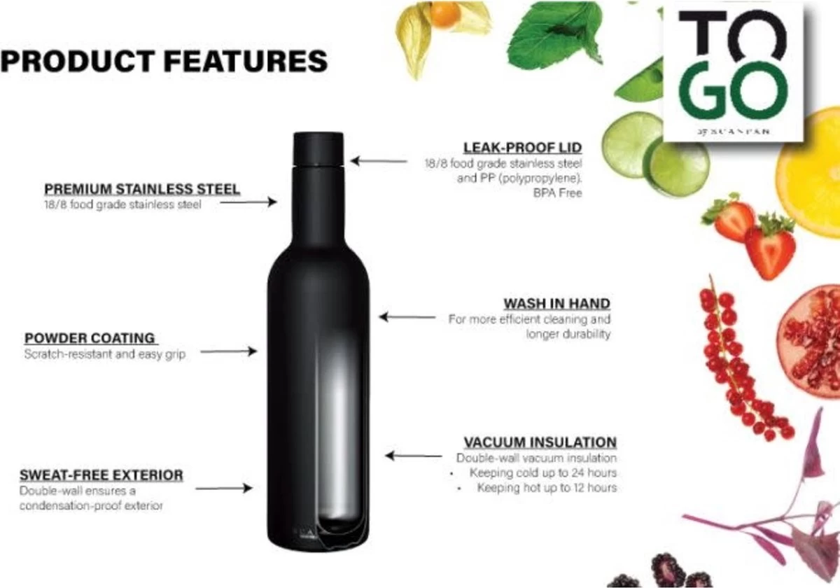 La bouteille et les gobelets ont une construction à double paroi. Cela maintient votre boisson à la température idéale. La double paroi offre également un extérieur résistant à la condensation. L’isolation sous vide garde le froid pendant 24 heures et le chaud pendant 12 heures. Le bouchon étanche de la bouteille signifie que vous n’avez pas à vous soucier du transport de la bouteille.