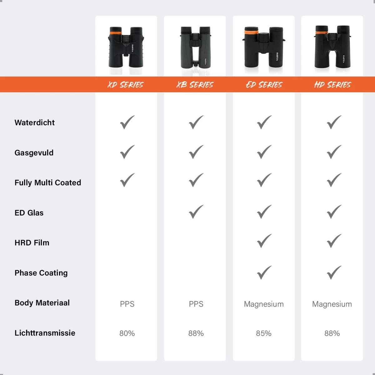 Ces jumelles compactes ne pèsent que 583 grammes, ce qui est sans précédent pour des jumelles de cette qualité robuste. De plus, le boîtier PPS garantit que le spectateur peut prendre une raclée. Ce plastique solide et léger peut supporter pas moins de 200 degrés et est donc insensible aux fluctuations de température et protège la verrerie de manière optimale.