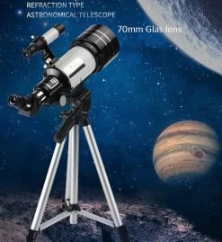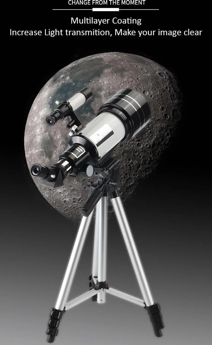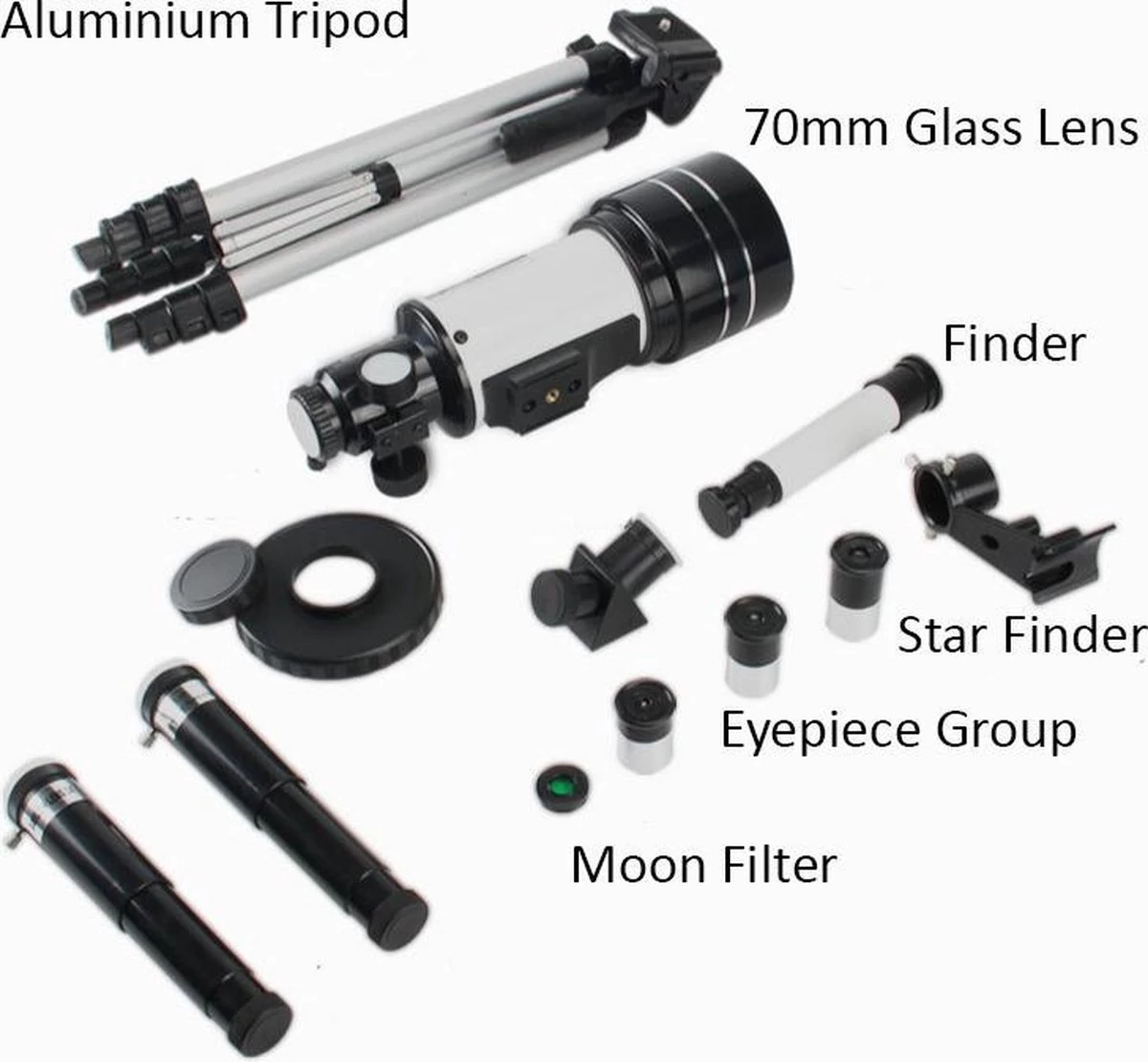 - Le télescope a 3 lentilles en verre enduit de (6 mm et 20 mm 25 mm) , un trépied en aluminium réglable en hauteur et un télescope de recherche montable (5 x 24) pour localiser facilement les objets.