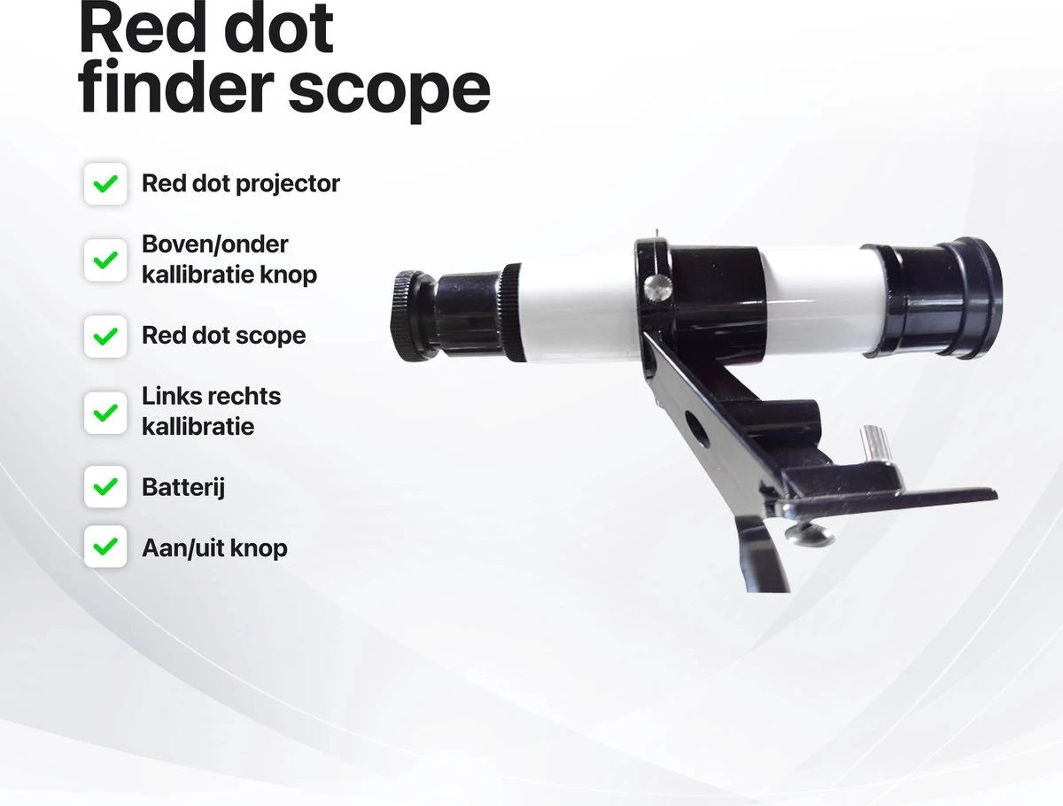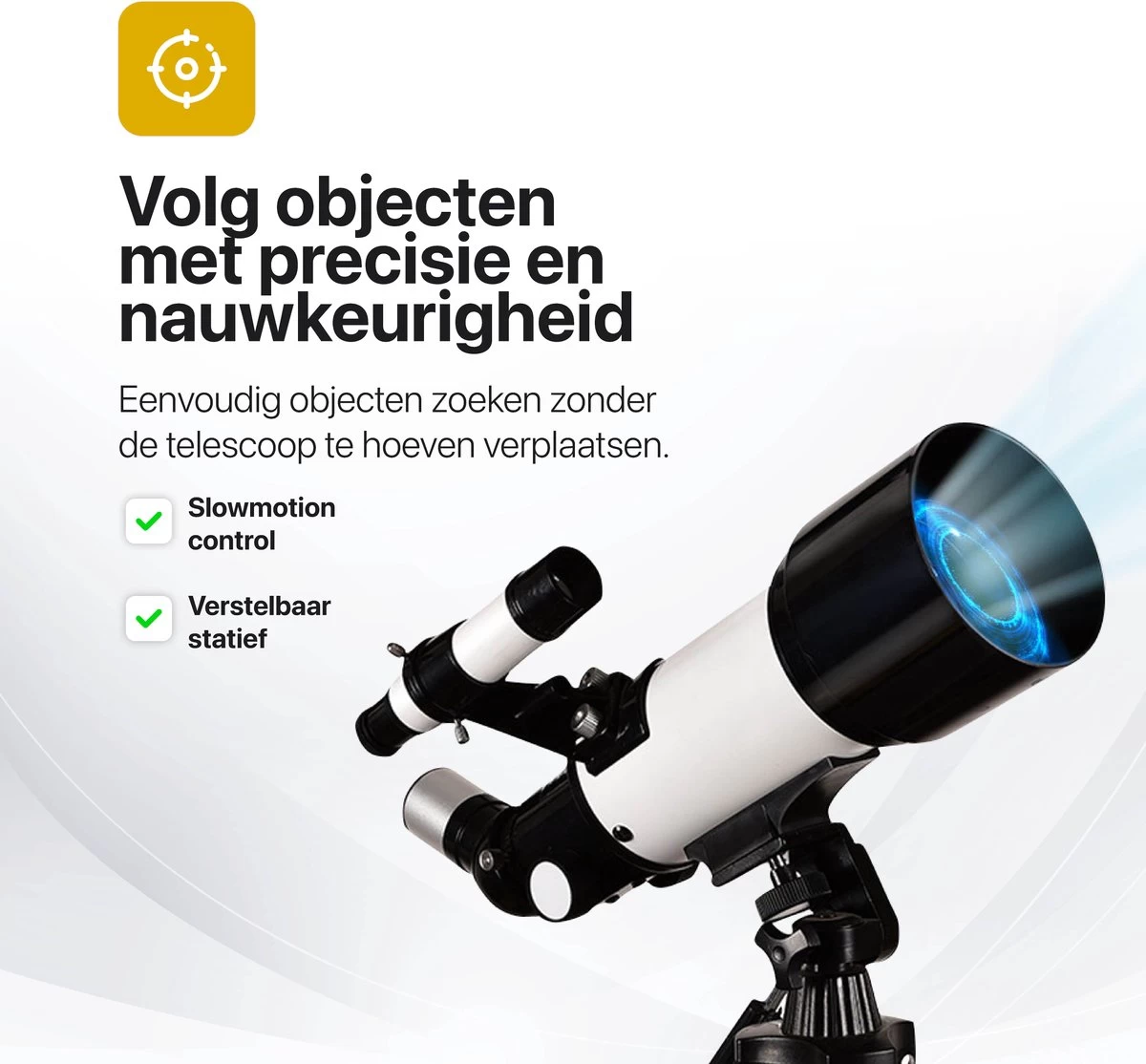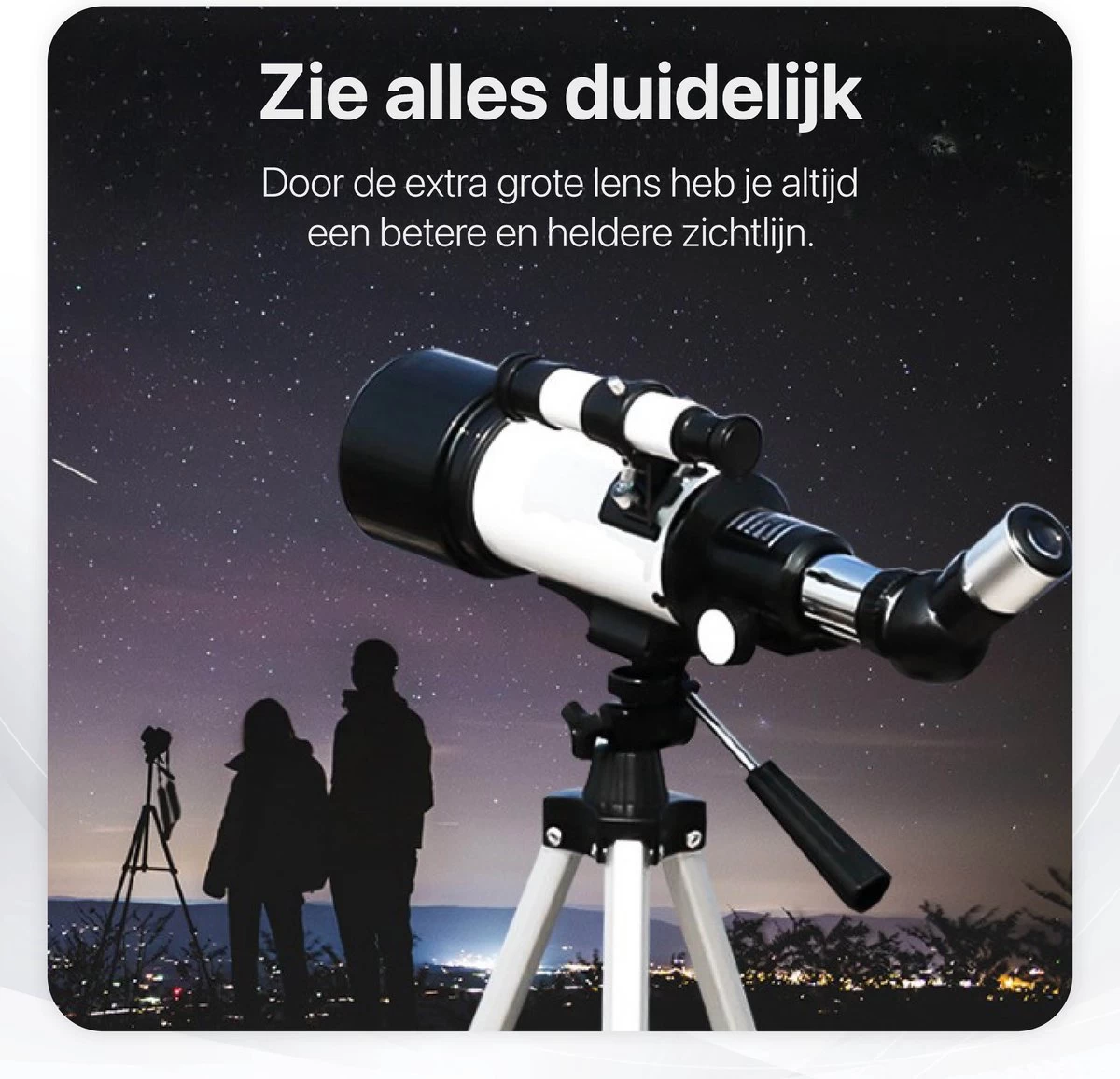 Le télescope est équipé d’untrépied réglable (45-122cm). En plus de cela, cela maintient le télescope stable, afin que vous puissiez profiter de toutes les belles images, cela garantit également que tout le monde, du plus petit au plus grand, puisse utiliser le télescope. Le poids léger (3 kg), le trépied pliable et le sac de voyage inclus permettent d’emporter facilement le télescope à l’endroit de votre choix. Le trépied estRotatif à 360° et inclinable à 180° . De cette façon, vous pouvez facilement visualiser n’importe quel objet.