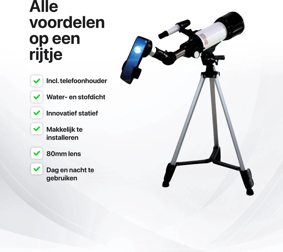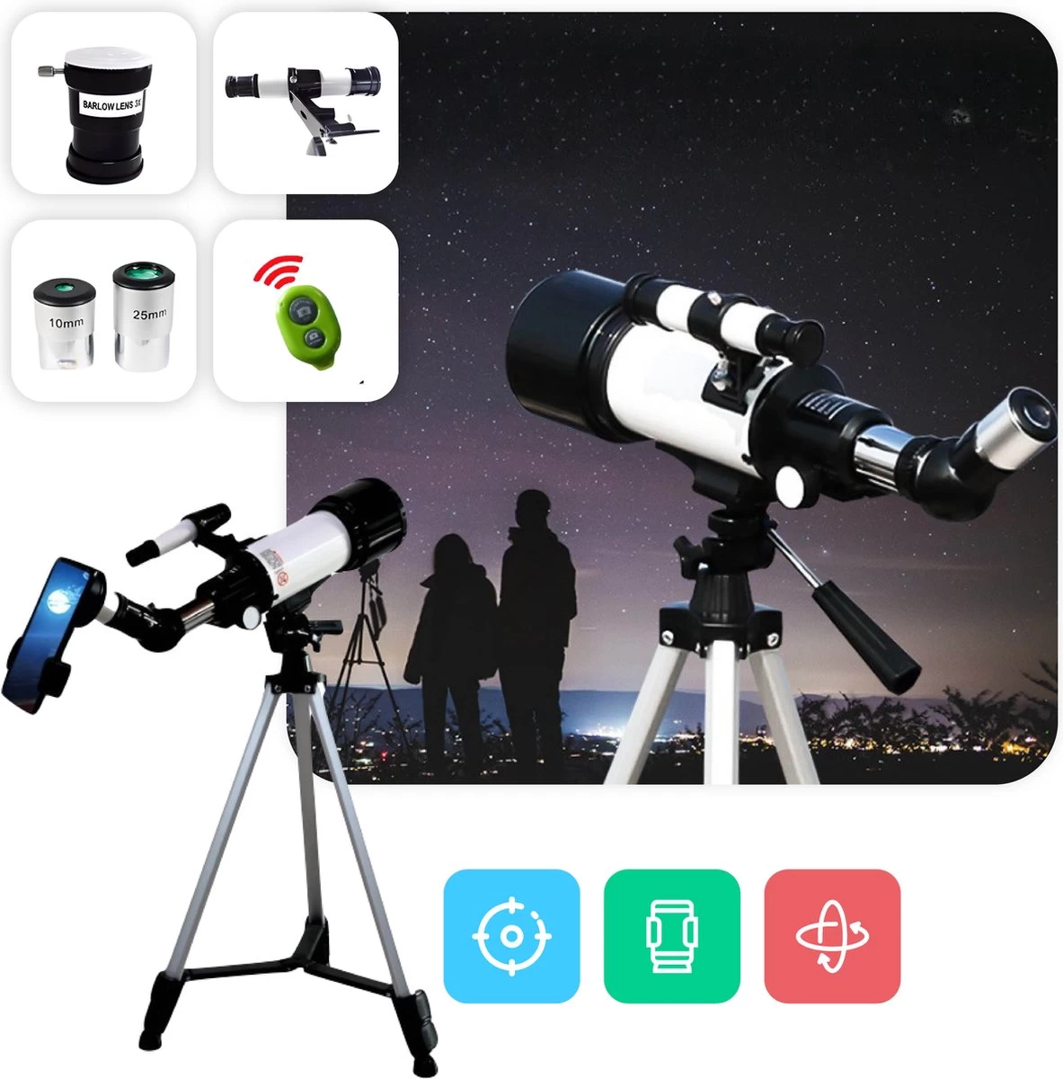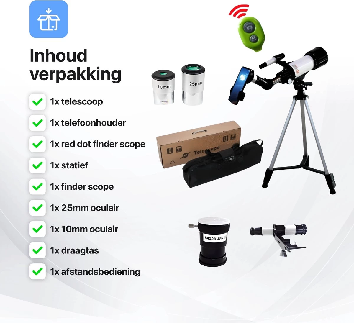 Le télescope est équipé d’untrépied réglable (45-122cm). En plus de cela, cela maintient le télescope stable, afin que vous puissiez profiter de toutes les belles images, cela garantit également que tout le monde, du plus petit au plus grand, puisse utiliser le télescope. Le poids léger (3 kg), le trépied pliable et le sac de voyage inclus permettent d’emporter facilement le télescope à l’endroit de votre choix. Le trépied estRotatif à 360° et inclinable à 180° . De cette façon, vous pouvez facilement visualiser n’importe quel objet.