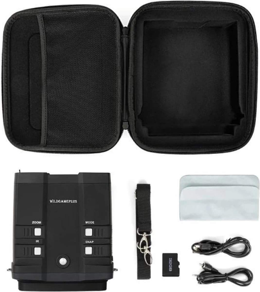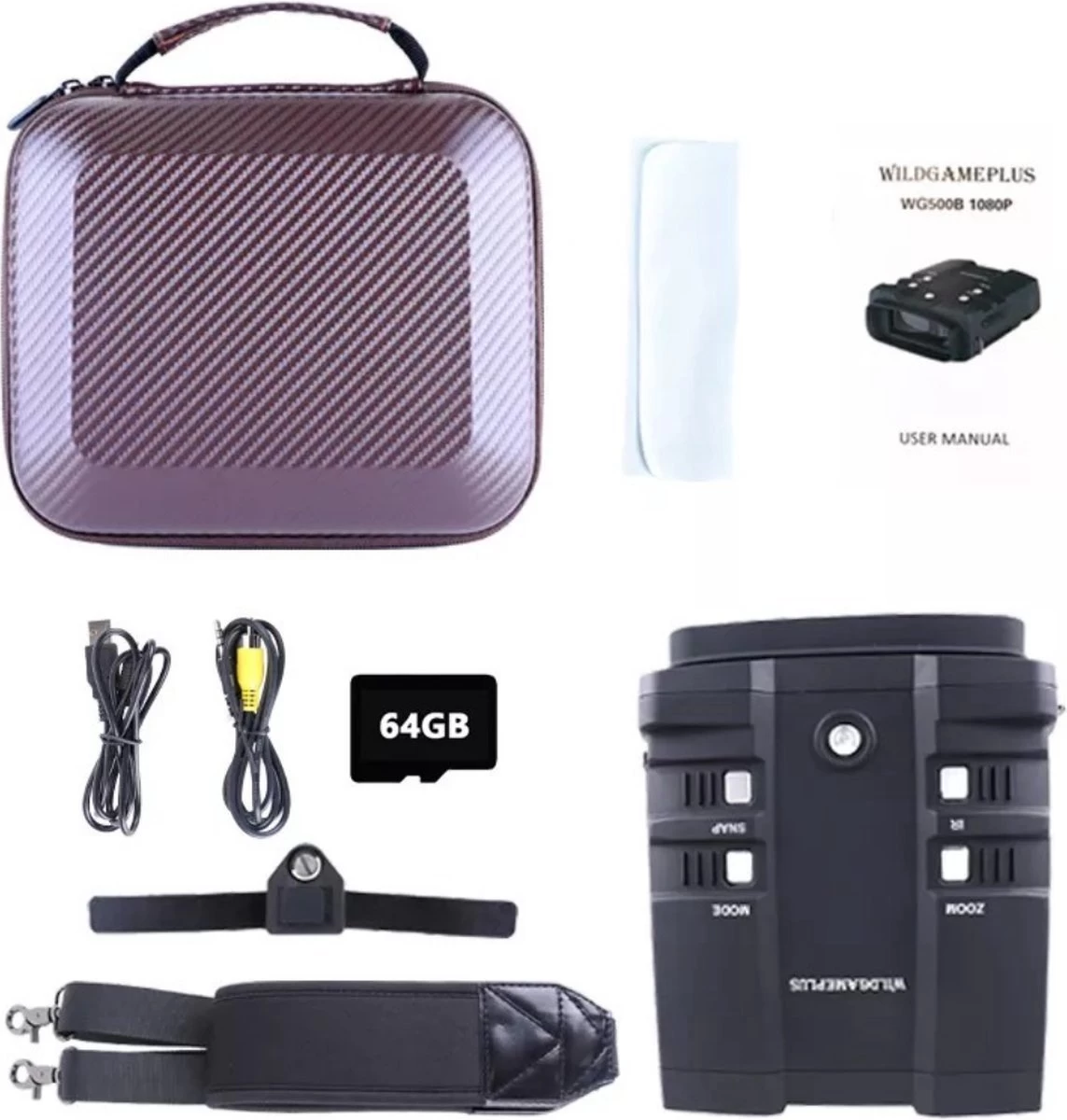 Contenu de votre commande 1x Lunettes de vision nocturne 1x Carte TF 64G 1x Boîte de rangement 1x Riem 1x Manuel 1x Câble AV 1x Câble USB 1x Chiffon de nettoyage