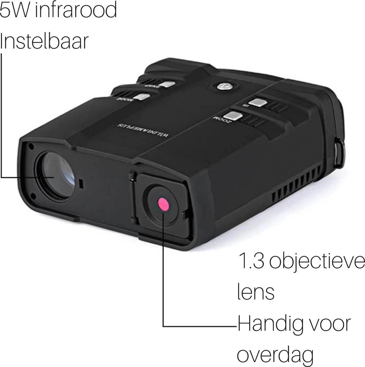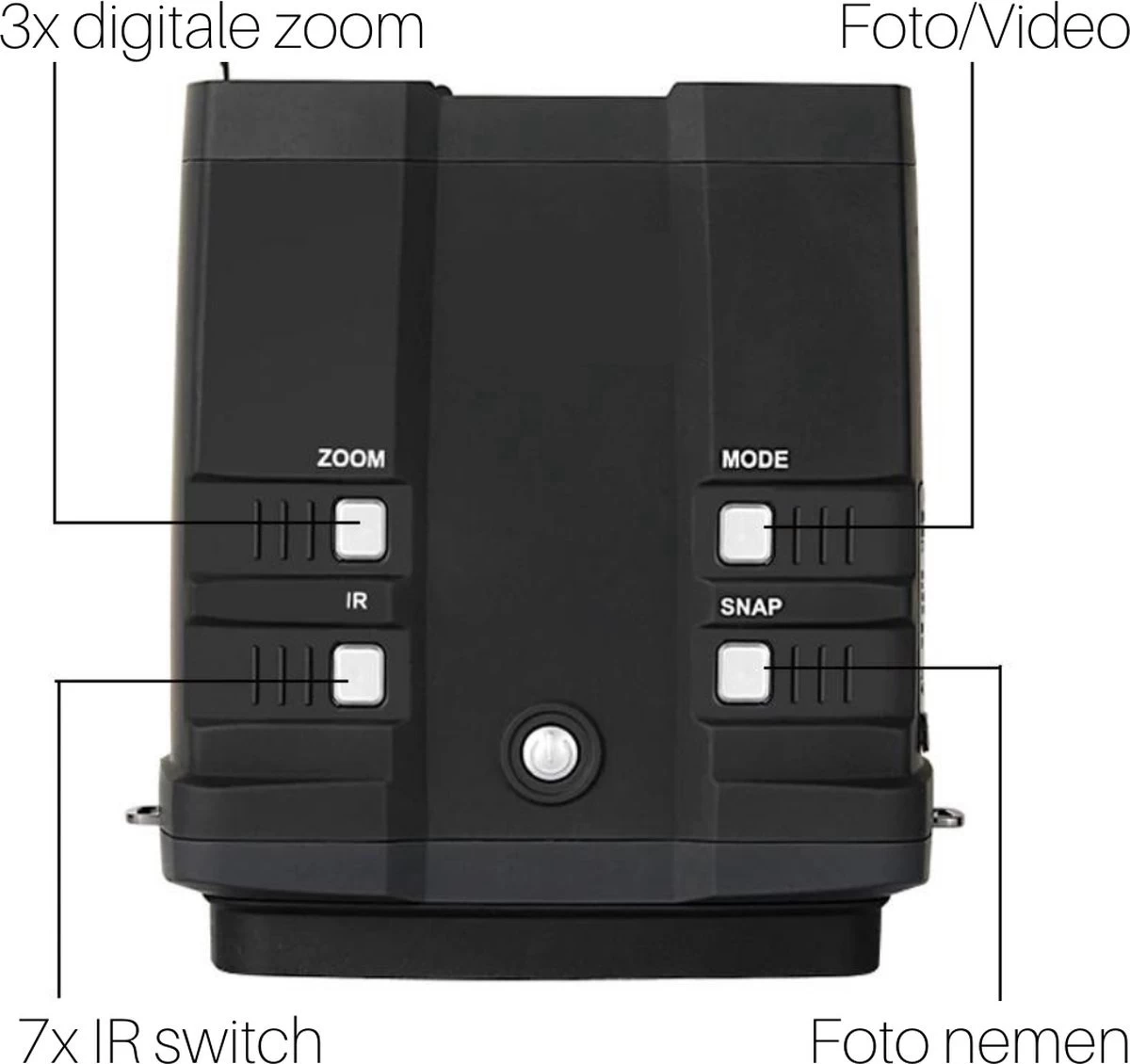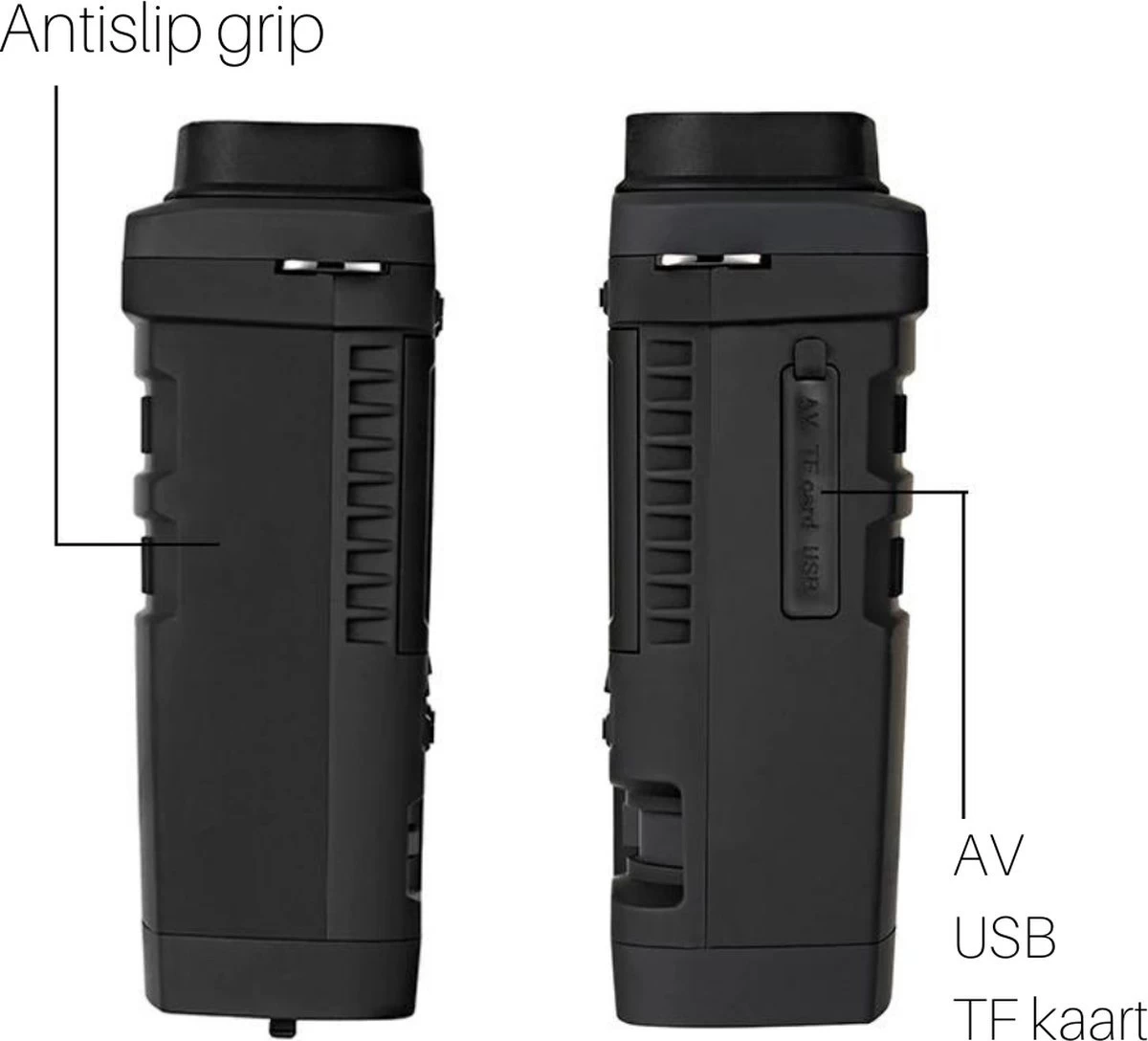 7 modes IR – De cette façon, vous pouvez facilement modifier l’intensité du filtre infrarouge pour voir encore mieux.Expérience étendue de la vision nocturne ! Nous travaillons dans l’industrie de la vision nocturne / des jumelles depuis un certain temps et avons donc une connaissance très approfondie des exigences auxquelles doit répondre un appareil de vision nocturne de bonne qualité. La qualité est donc d’une importance primordiale pour nous et nous pensons qu’il est important que vous puissiez profiter de manière optimale du dernier Nachkijker.