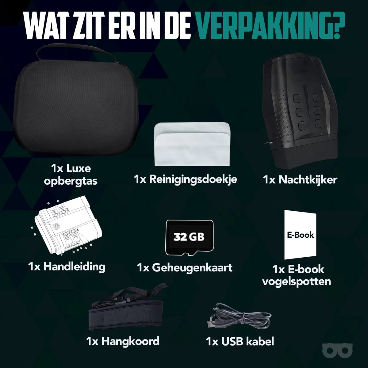 Cet appareil de vision nocturne est livré avec une carte mémoire de 32 Go qui enregistre immédiatement vos images. Que vous souhaitiez filmer tout l’après-midi ou toute la soirée, vous n’avez pas à vous soucier du stockage. Après le Berg , vous pouvez facilement ranger les lunettes de vision nocturne dans le sac de rangement de luxe fourni pour éviter tout dommage.