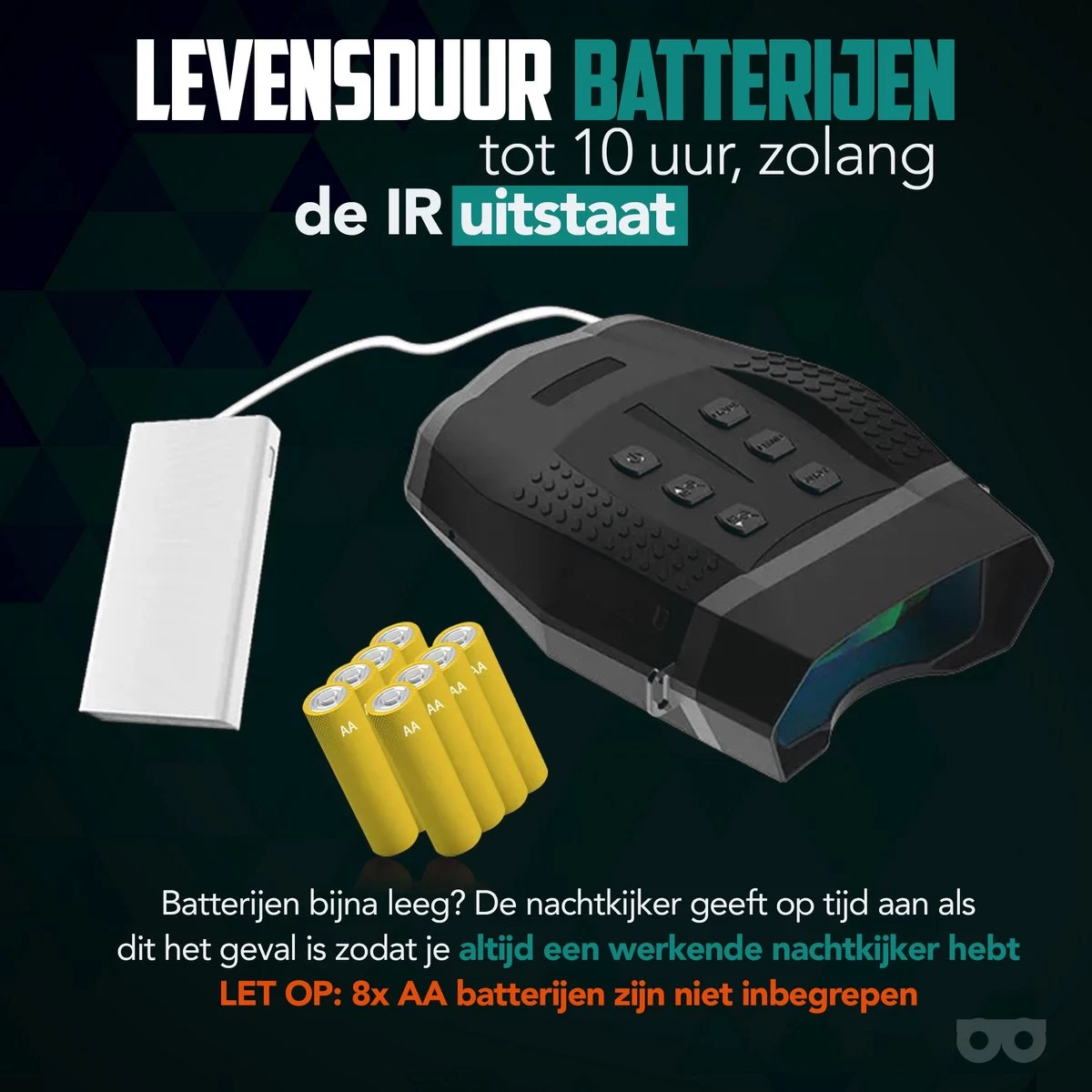 Le capteur CMOS intégré fournit une image parfaite et nette, de jour (400 m) comme de nuit (300 m) et envoie les images au processeur à la vitesse de l’éclair. Grâce au capteur, l’appareil de vision nocturne consomme moins d’énergie, ce qui lui permet de durer plus longtemps. Les piles durent jusqu’à 10 heures avec l’IR éteint. Piles faibles ? Les lunettes de vision nocturne indiquent à temps si tel est le cas, afin que vous puissiez les remplacer à temps. Les batteries sont faciles à charger avec une banque d’alimentation, alors ayez toujours un jeu supplémentaire pour ne jamais en manquer.